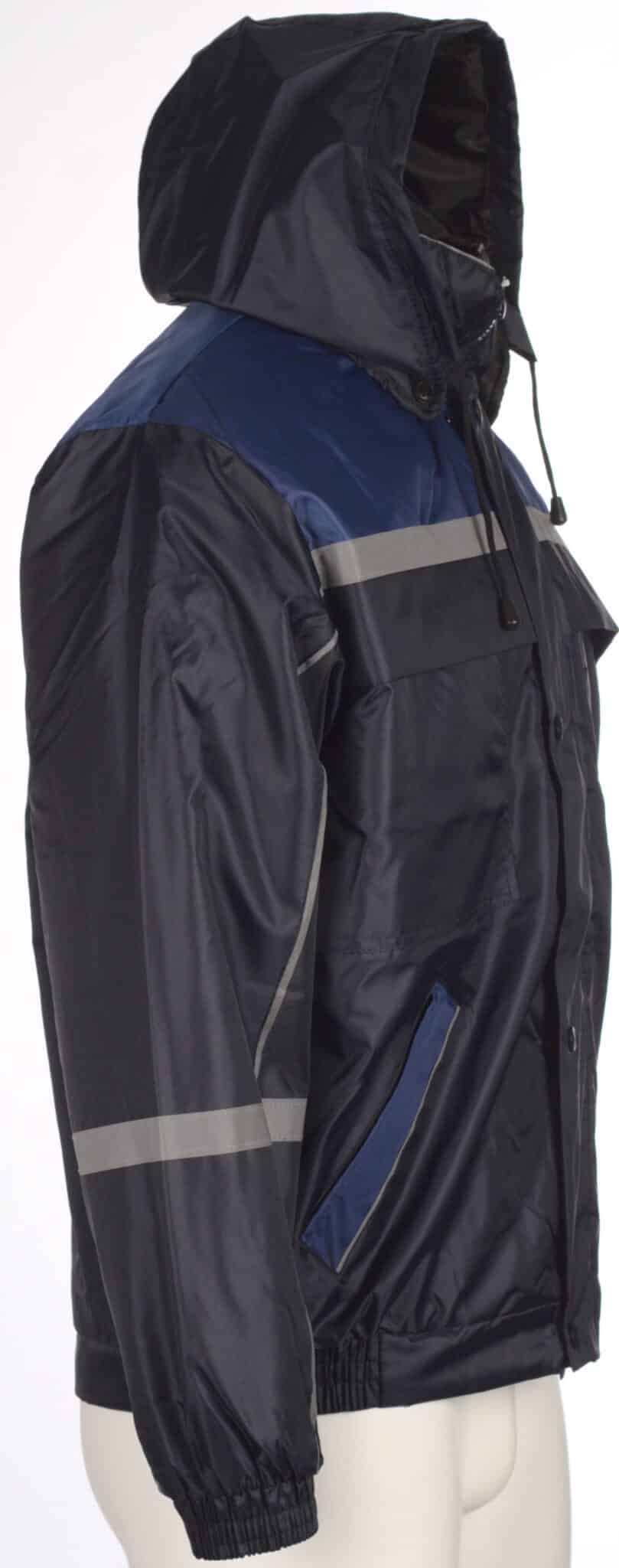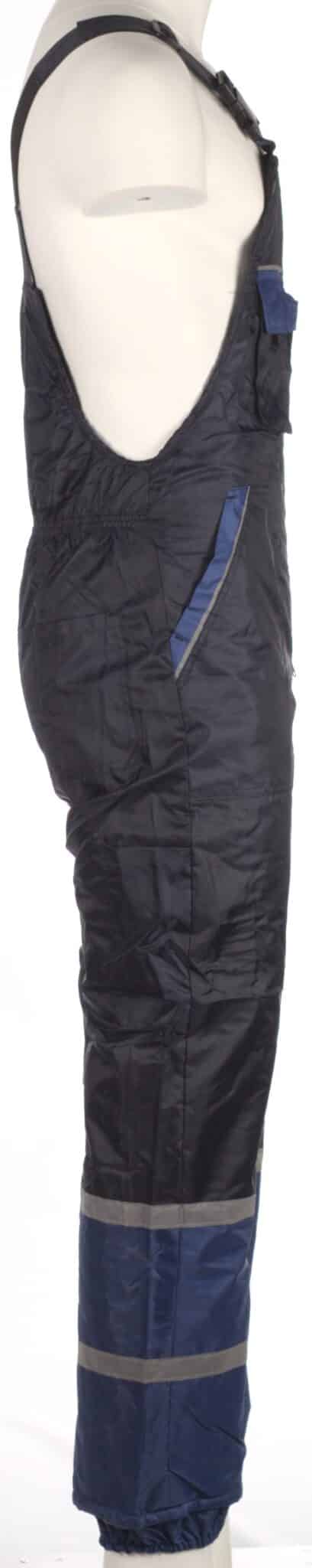 Ватиран работен костюм модел Колинс изработен от промазка в тъмносин цвят. Моделът се състои от яке и полугащеризон. Якето има общо пет джоба – два странични джоба, два нагръдни джоба с капаци и един вътрешен джоб от ляво. Закопчаването на якето е отпред по средата с цип и пластрон с тик-так копчета. Ръкавите са завършени с ластични маншети за по-добра изолация от външно влияние. Качулката е сваляща се, може да се прибира в яката и има опция за пристягане. Полугащеризонът има удължен гръб и ластик в кръста. Изработен е с общо четири джоба. Има два странични джоба, един нагръден джоб за мобилен телефон с капак и един заден джоб от дясната страна. Презрамките на полугащеризона са регулируеми и ластични. Комплектът ви осигурява добра видимост през нощта чрез светлоотразителните ленти на якето и на полугащеризона. Костюм Колинс тъмносин може да разгледате и във фирмените магазини на Тики в страната. Предлагаме модела и във вариант от сива промазка.
