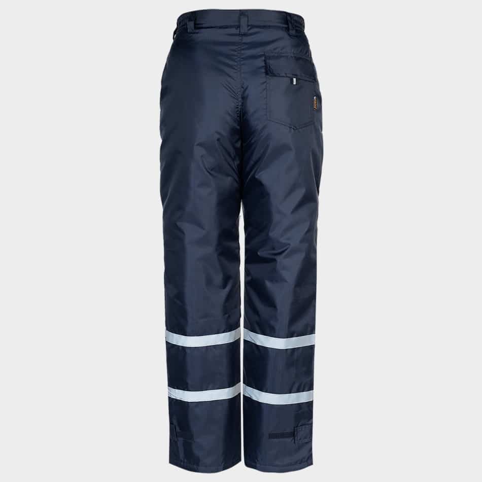 Ватиран работен панталон модел Колинс в тъмносин цвят със светлоотрзителни елементи. Този модел е отличен за част от зимната ви работна униформа. Изработен е от промазка в тъмносин цвят и има светлоотразителни елементи в долната част на крачолите. Осигурява защита от вятър и пръски вода. Моделът има общо три джоба: два странични джоба и един заден джоб от дясната страна. Закопчава се отпред с цип и има частичен ластик на кръста. Ватиран работен панталон модел Колинс в тъмносин цвят е отличен за работа на открито през зимата. Може да си го поръчате в допълнение към зимен комплект Колинс в тъмносин цвят, за да имате опция за смяна на долнището.