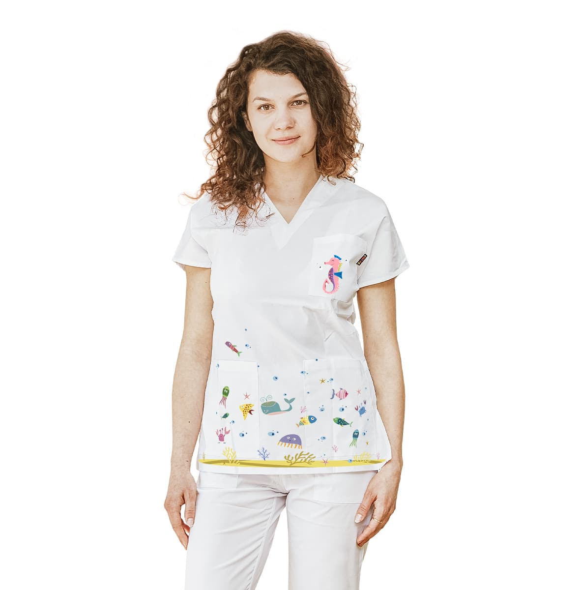 Тази туника, предлагаме и в светло син вариант – унисекс, който е подходящ и за двата пола. Океанското дъно е много цветно и колоритно, посредством уникална технология на печат DTG с безвредни мастила на водна основа. Само при нас имате възможност за брандиране на джоба с име, лого или длъжност срещу допълнително заплащане от € 2,86 / 5,60 лв.