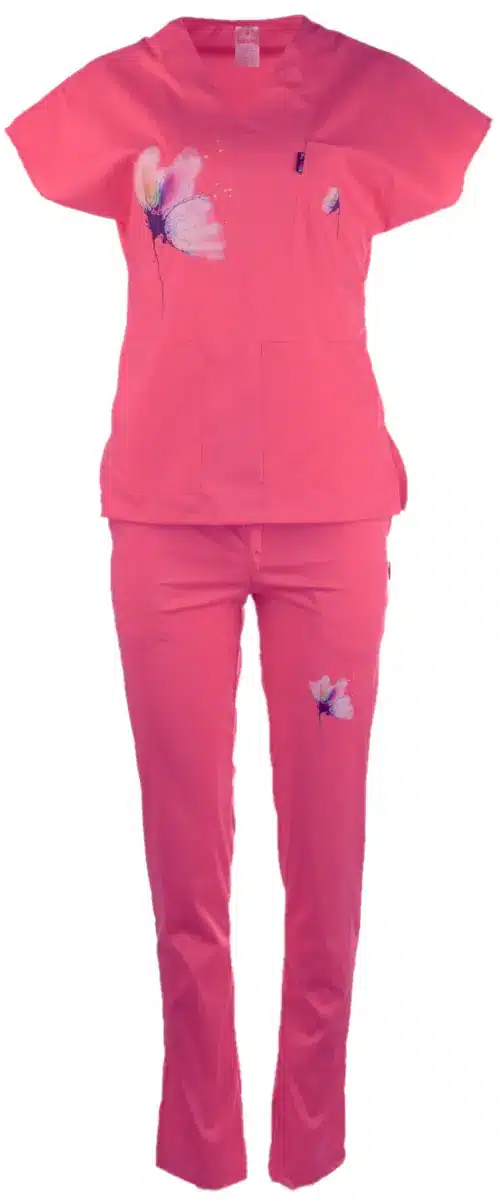 Медицински втален костюм Blossom в розов цвят. Уникалния дизайн е дело на художничката Пламена Войнова. Комплектът се състои от туника и панталон с втален силует в розов цвят с пълноцветен дигитален печат. Изработен е от лека и мека материя, за да ви създаде удобство през целия работен ден. Туниката е с паднал ръкав, остро деколте и три практични джоба, които са идеални за съхранение на аксесоари от първа необходимост. Панталонът е с вталена кройка и добавен ластик с връзки на кръста, за да ви осигури свобода на движенията дори през дългите дежурства. С два италиански джоба, панталонът съчетава стил с функционалност. Костюм Blossom в розов цвят е оригинално предложение за работна униформа за медицински сестри, козметички, персонал в детски заведени и за много други сфери на дейност. Той придава не само стилна, но и елегантна работна визия. Освен в розов цвят можете да поръчате комплекта в нежно лилав цвят или тюркоаз. Имате възможност да поръчате и по отделно туника и панталон Blossom. Може и да комбинирате различни цветове на туниката и панталона, за да изразите индивидуалност. За завършена работна визия, разгледайте предложенията ни за медицинско сабо и медицински шапки.