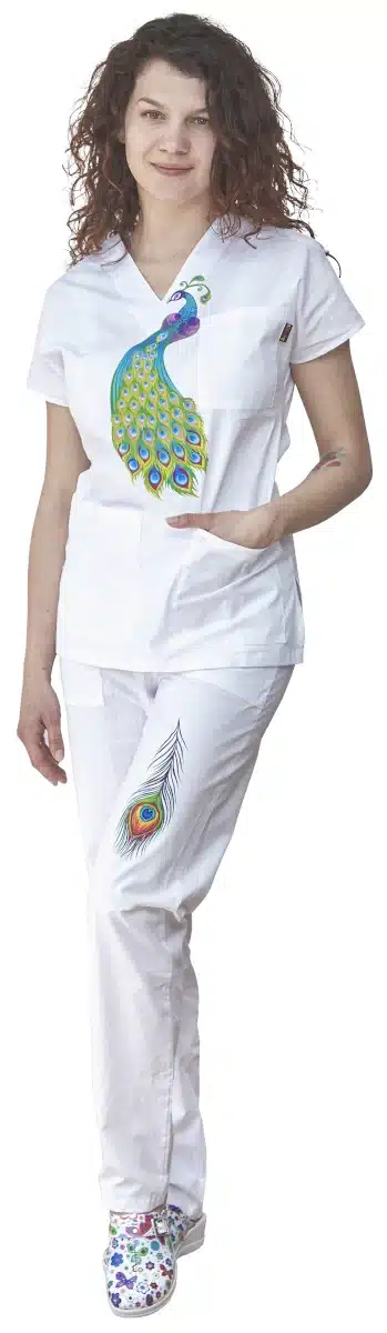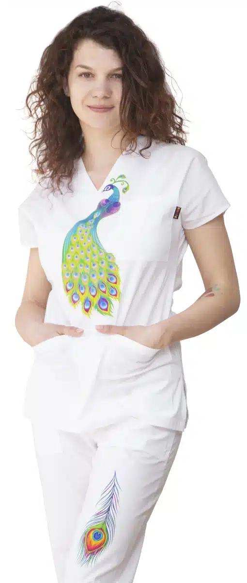 Дамска медицинска бяла туника с печат паун. Моделът е изработен с вталена кройка, остро деколте и три джоба. Цветът на туниката е снежно бял, а изображението на пауна е пълноцветен дигитален печат. Туниката е оригинално предложение за медицинска работна униформа за всяка дама медик, за персонал в аптеки или в детски заведения. Отлична е и като подарък за специален човек. Предлагаме този модел и в комплект с втален панталон с печат паун. По желание на клиента можем да добавим печат с името и длъжността ви върху джоба на туниката срещу доплащане от € 2,86 / 5,60 лв. За завършена работна визия изберете от предложенията ни за медицинско сабо и медицински шапки.