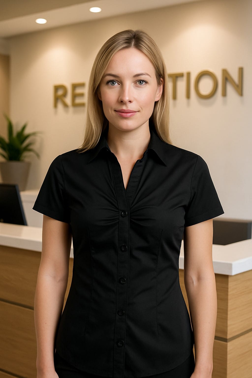 Бюстът е допълнително подчертан с фини басти, които придават елегантен завършек. Двойната яка с леко отворена горна част и обшитите предни краища на закопчалката правят модела подходящ както за официални поводи, така и за работна униформа в хотели, ресторанти или офиси.