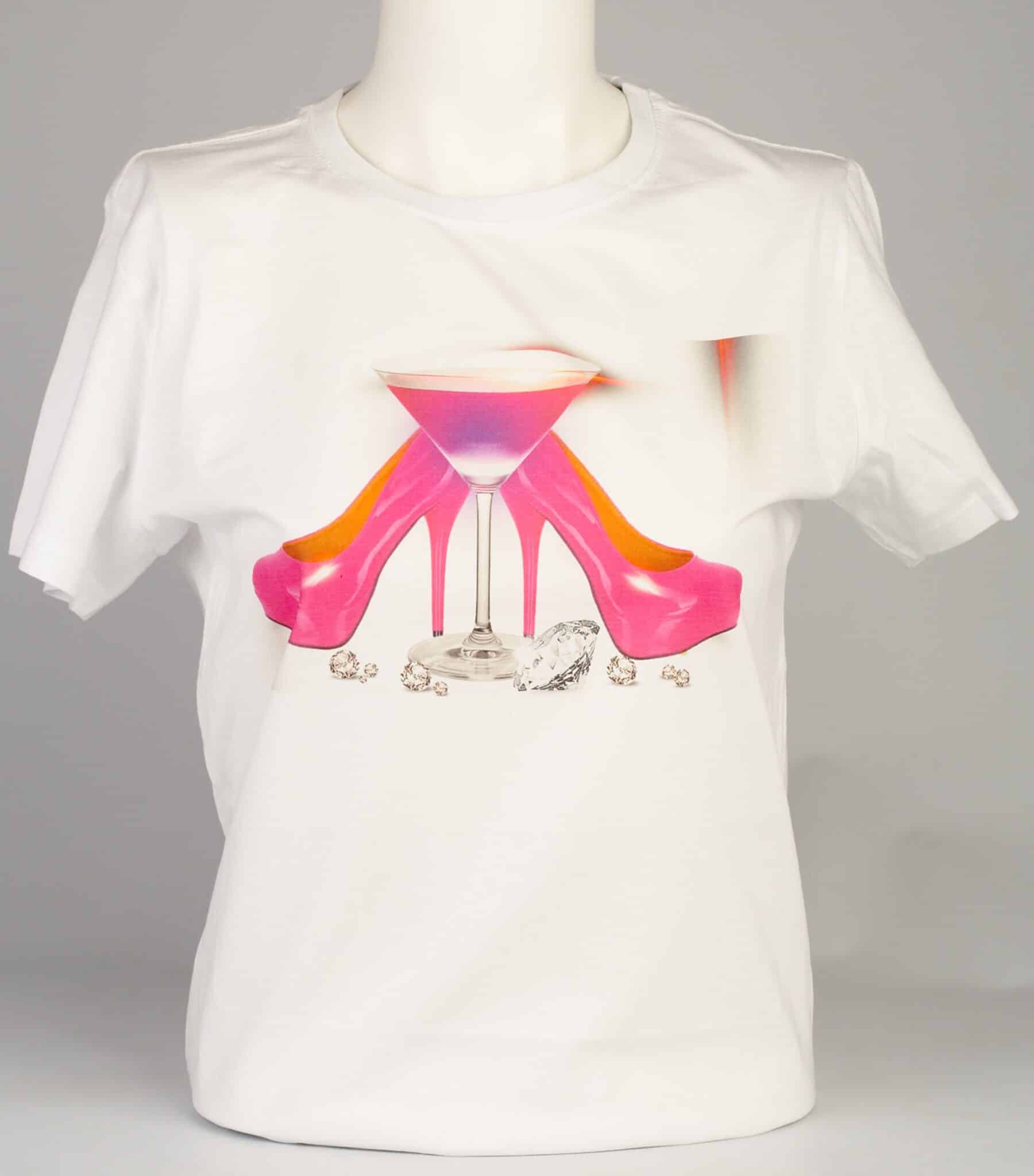 Дамска памучна тениска, бяла на цвят, с цветен печат Shoes and Diamond. Изображението върху тениската е висококачествен дигитален печат. Дамска тениска Shoes and Diamond е чудесно предложение за подарък на ваша приятелка или близка. Имате възможност да поръчате и тениски с печат по ваш личен дизайн или с печат на ваши снимки. Можете да избирате между дамски, мъжки или детски тениски. Разгледайте и останалите предложения за тениски с печат в галерията ни.