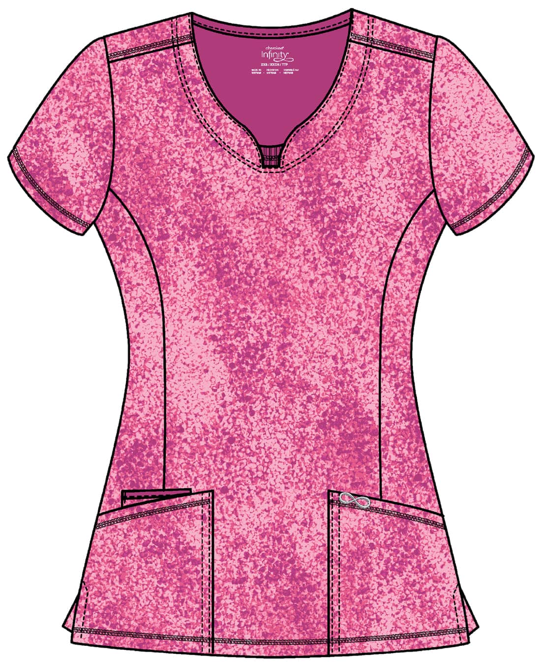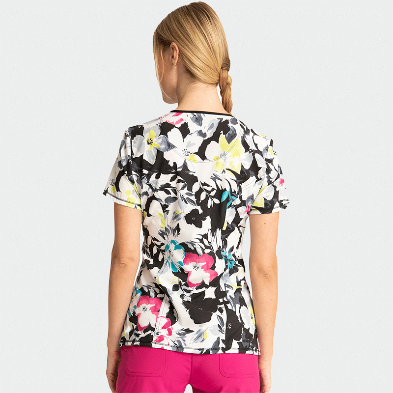 Поръчайте онлайн дамска туника Инфинити – Cherokee за комфорт и удобство по време на работа.  Стилна медицинска туника с модерна кройка и женствен дизайн. Моделът е с леко втален силует и обло деколте. Има къс ръкав и красив цветен принт в тюркоаз и розово върху черна основа. Разполага с два удобни предни джоба и един малък вътрешен джоб. Материята е мека и лека – 94% полиестер и 6% еластан с плътност 175гр/м². Осигурява комфорт през целия ден и лесна поддръжка.
