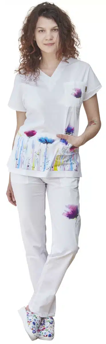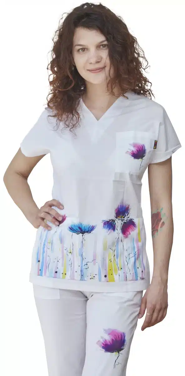 Дамски медицински костюм с печат цветя. Медицинската униформа е с високо съдържание на памук 97% и 3% ликра, които осигуряват еластичност и удобство през работния ден. Печата е с мастила на водна основа, като същевременно е изключително наситен и цветен. Костюма се състои от две част: вталена медицинска туника и втален дамски панталон. Туниката има три джоба, панталона е с два италиански и един заден джоб. Цветния принт е авторска разработка на художничката Пламена Войнова, направен специално за клиентите на фирма Тики. Белия костюм е изключително подходящ за медицински работници, като работна униформа за детски градини и в много други браншове. Идеален подарък за лекар с добавка на име.