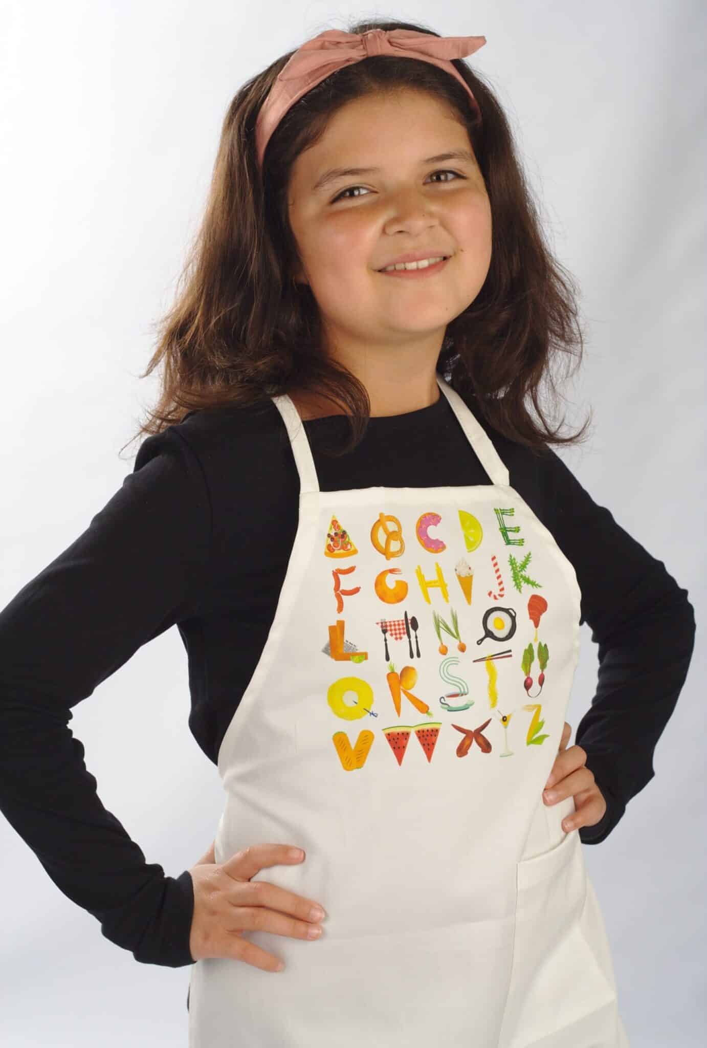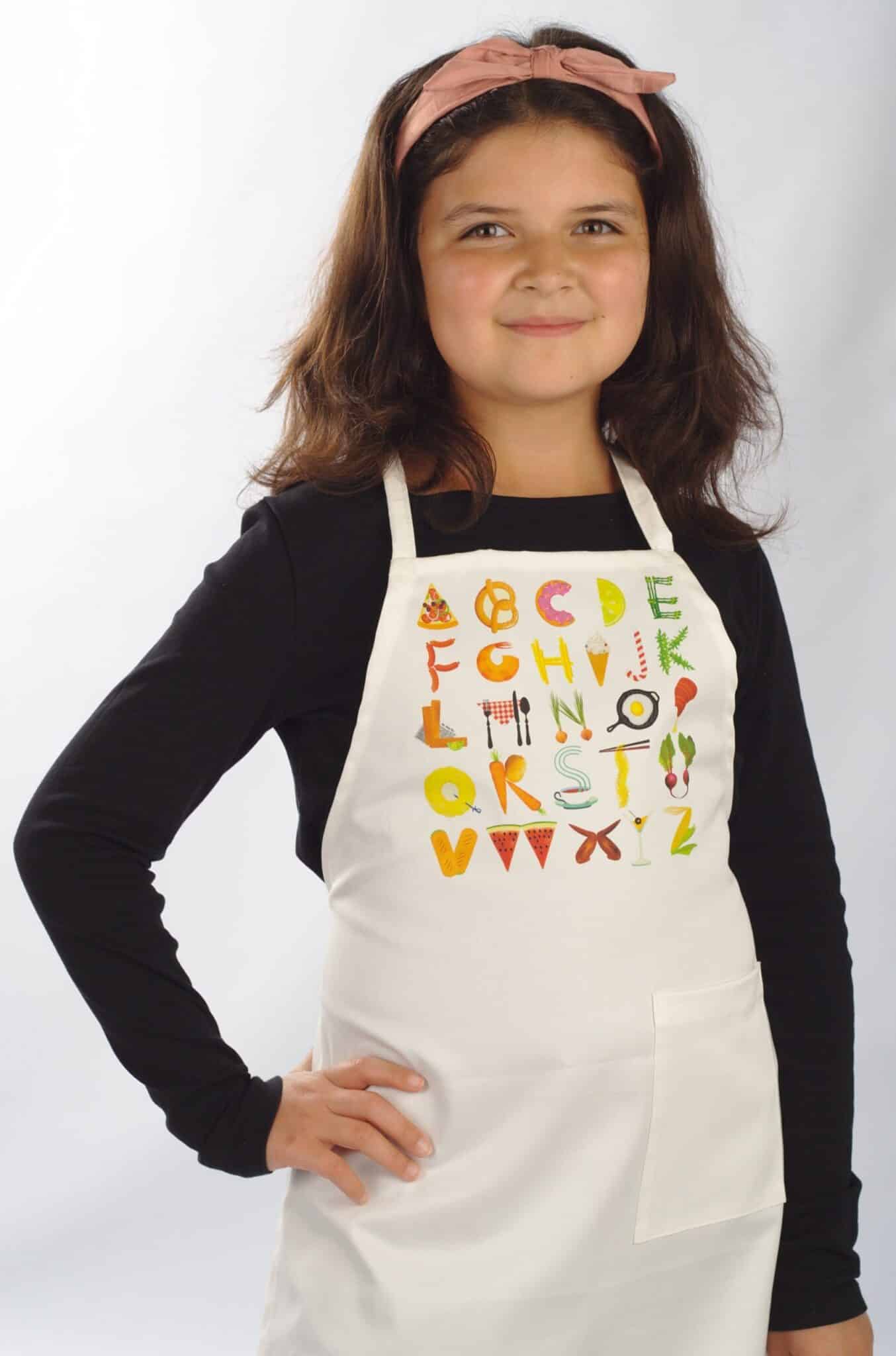 Готварска детска престилка в бял цвят с връзка през врата с печат – Азбука. На престилката е отпечатана английската азбука по много забавен начин с различни видове храни. Изработена е със страничен джоб и дълги връзки през кръста за регулиране на широчината. Материята е много мека, а размерът е универсален. Престилката може да бъде изработена по ваш избор с две отделни връзки на врата за регулиране на дължината. Детската готварска престилка е със следните размери: дължина – 64 см, широчина в най-широката част – 46 см. Персонализирайте тази уникална детска престилка и добавете имете на детето срещу доплащане от € 2,86 / 5,60 лв. Оригинален подарък, с който да зарадвате бъдещите готвачи. Предлагаме и детски тениски с уникален дизайн и възможност за добавка на име. При нас имате възможност да поръчате различни видове престилки за групи в детска градина, уоркшоп, курсове и много други. Възползвайте се от възможностите ни за бродиране и печат, за да рекламирате бранда си. Поръчайте онлайн детска престилка с печат Азбука и се забавлявайте, докато готвите заедно.