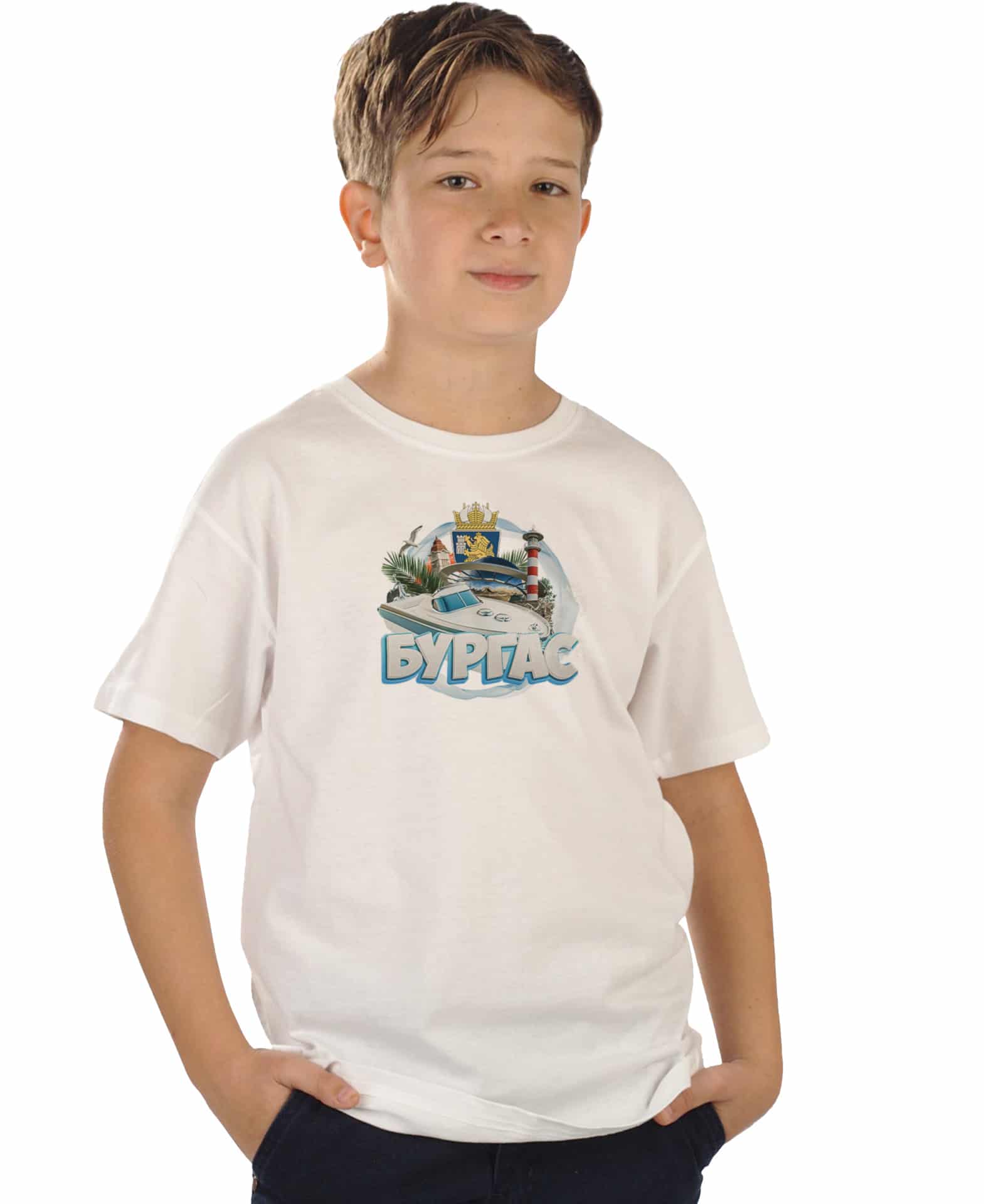Покажете своята любов към красивия град Бургас с нашата детска тениска Бургас. Тя пресъздава магията на слънчевия град Бургас. Модела е с изключителен дизайн,включващ символите на Бургас – фара, морето, гларусите и часовника. Тази тениска е перфектният избор за всяко дете, което обича да носи част от Бургас със себе си. Изработена от 100% висококачествен мек памук. Кройката й е права и свободна. Тя предлага комфорт и стил, което я прави изключително подходяща за ежедмевно носене. Тениската се предлага в 6 размера: от 2 до 12 години. Детска тениска Бургас може да намерите както онлайн, така и във фирмените ни магазини в Бургас. Разгледайте също и дамска и мъжка тениска Бургас.