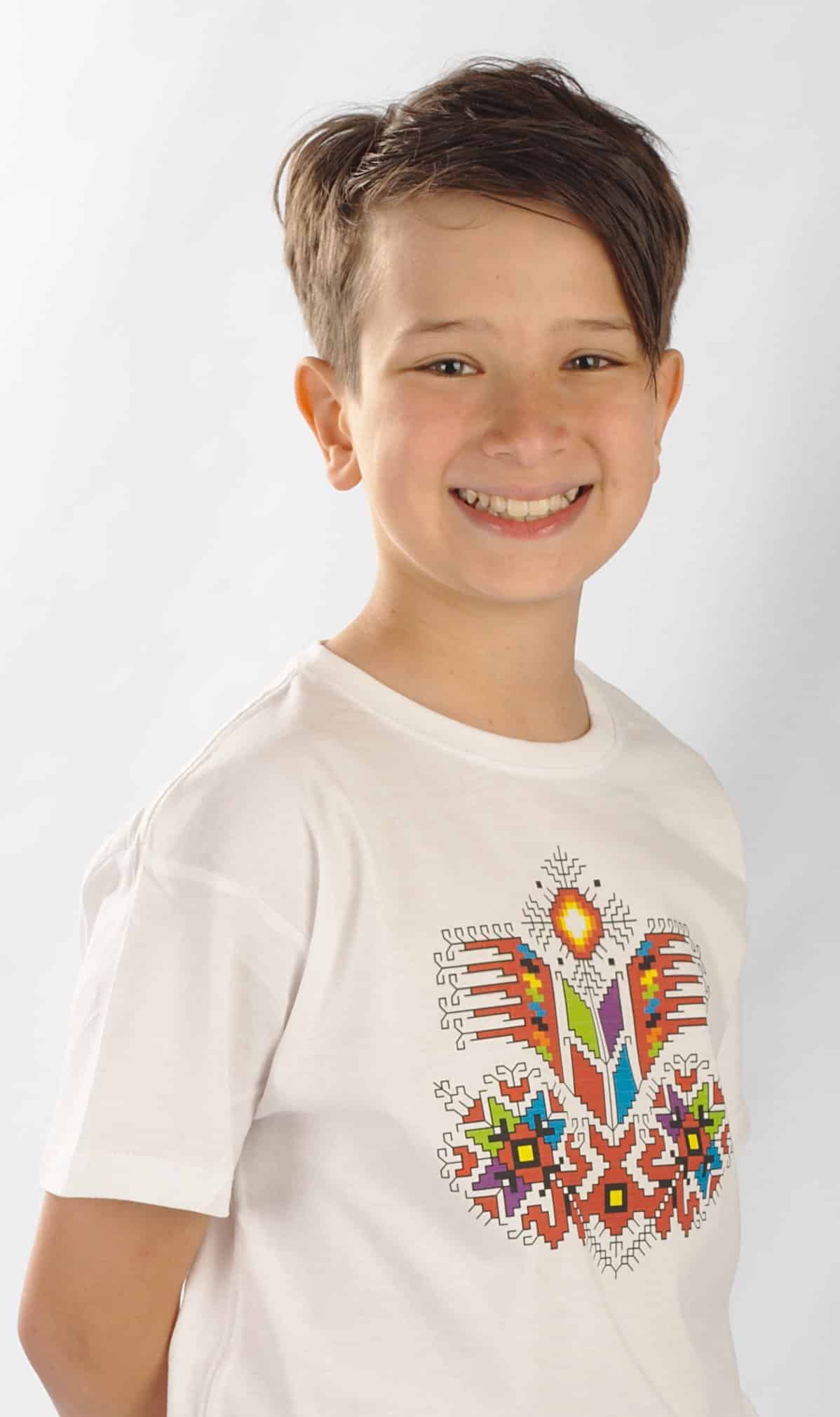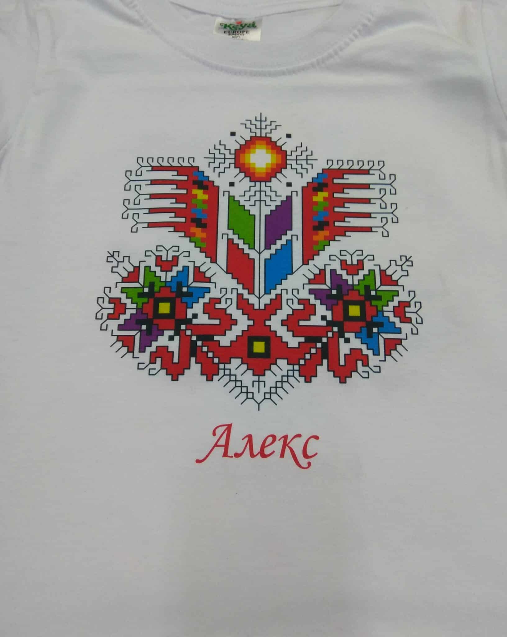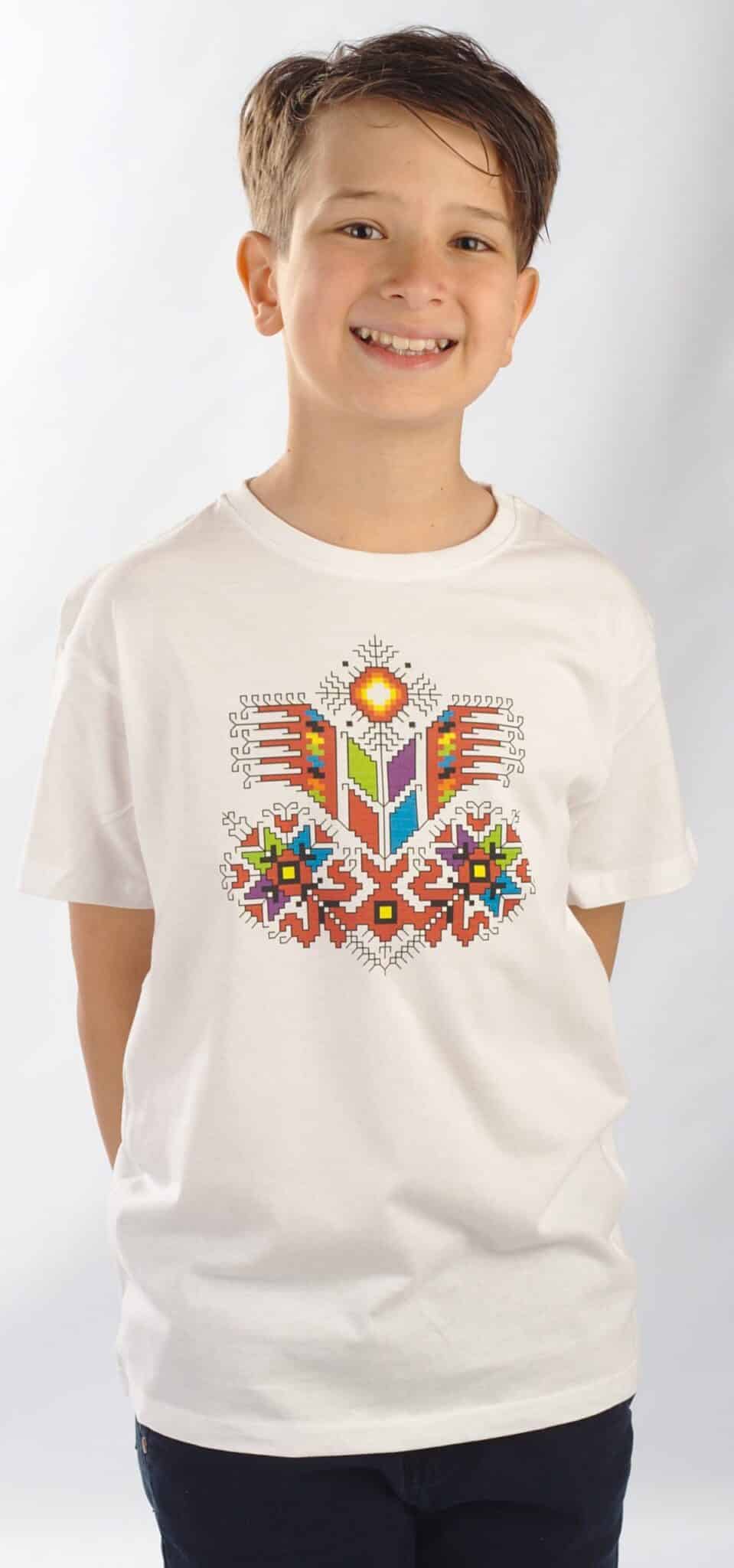 Памучна детска тениска в бял цвят с дигитален печат шевица с мотив Дървото на живота. Шевицата е отпечана чрез висококачествен DTF печат. Тази технология на печат е устойчива при пране и надраскване. Чрез дигиталния печат може да се постигне отлично фотографско качество на отпечатъка. Материята на тениската е 100% памук и е много мека. Предлагаме детска тениска с печат шевица Дървото на живота в размери: за деца от 2 до 12 години. По желание на клиента можем да добавим печат с името на вашето дете срещу доплащане от 2,50 лв. Тениска с шевица Дървото на живота може да поръчате и в мъжки вариант.