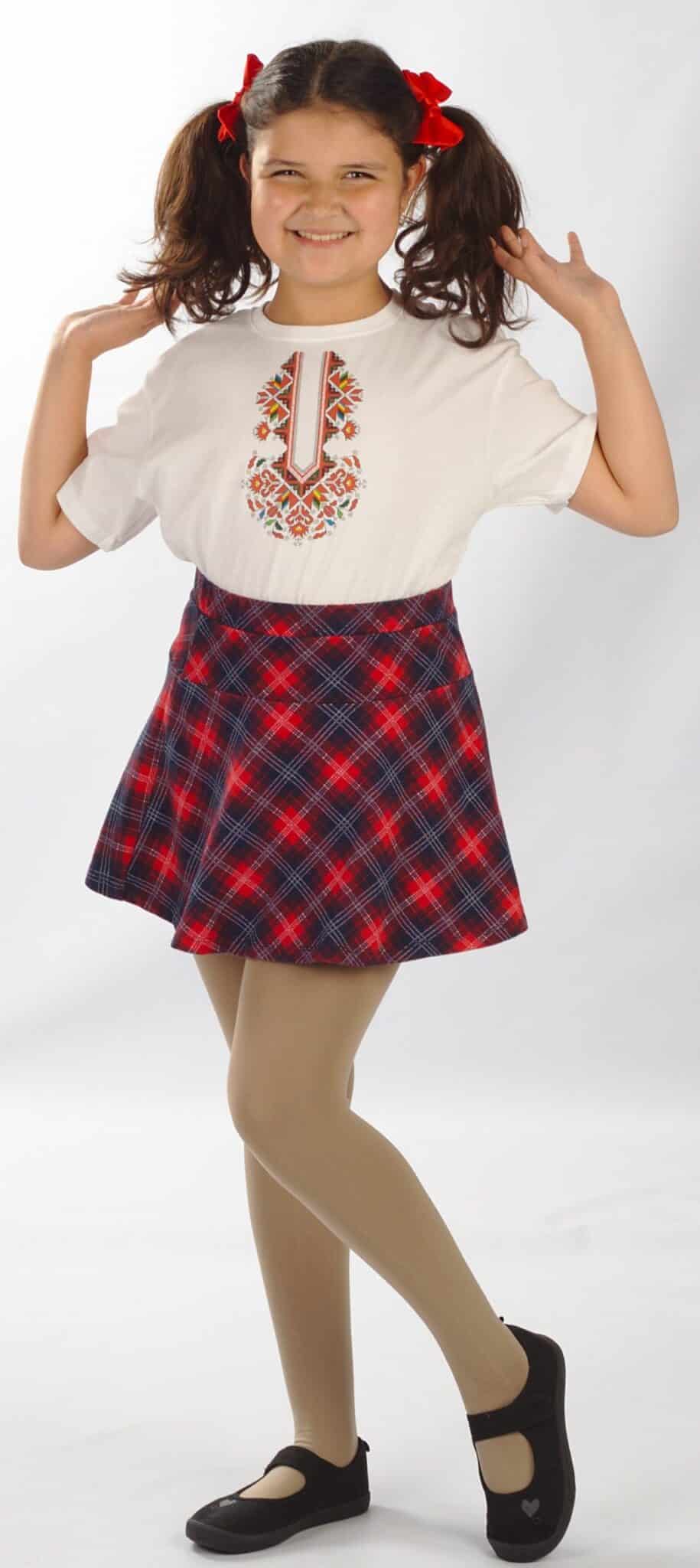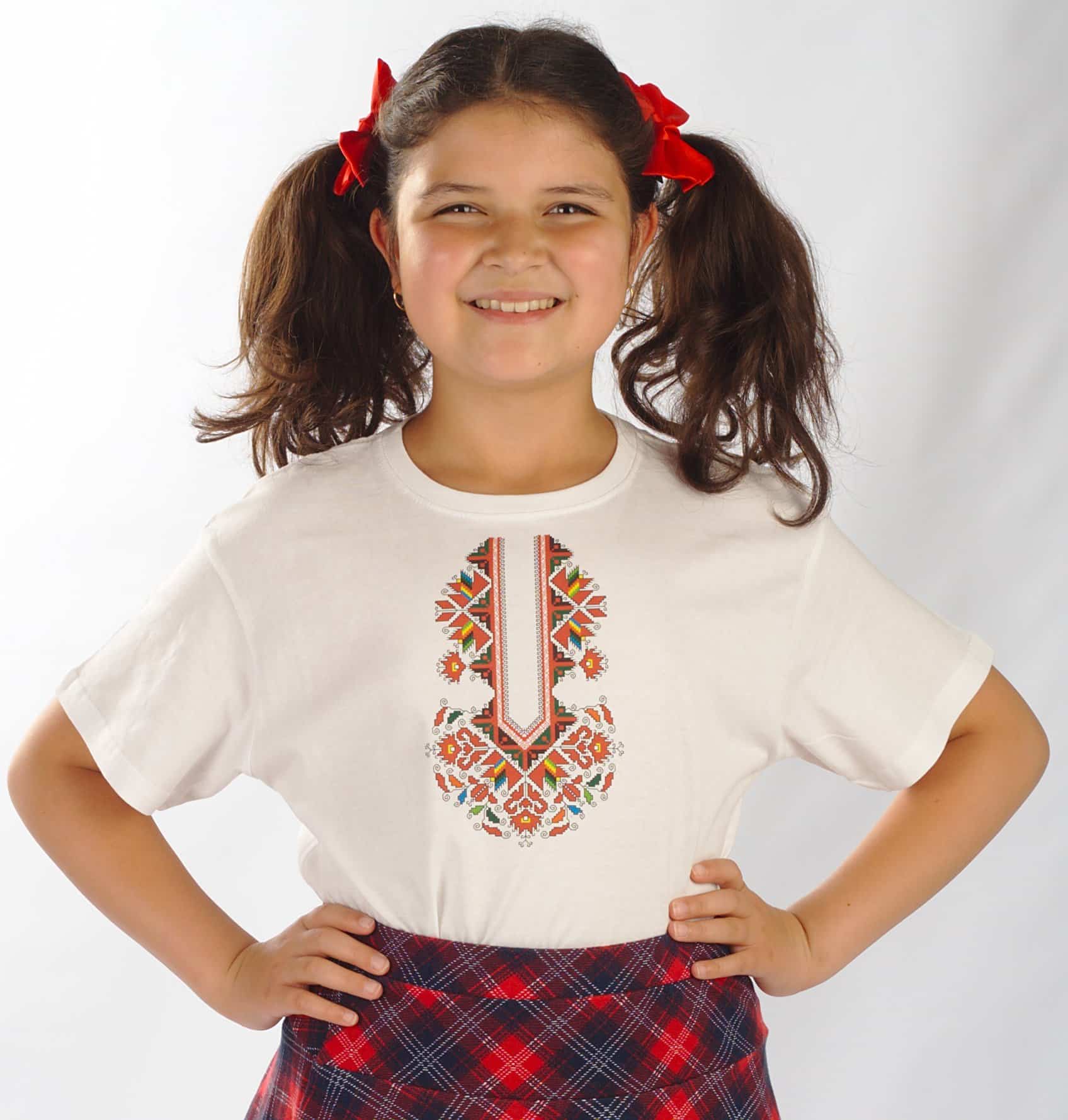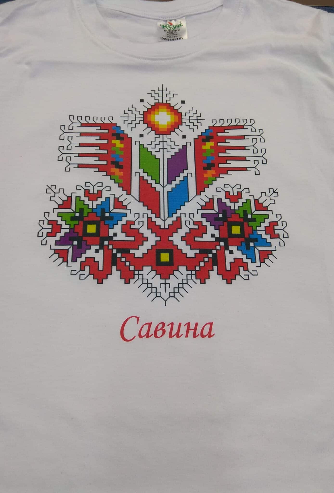 Памучна детска тениска в бял цвят с дигитален печат на шевица по мотив Лазарки. Изображението е отпечатано чрез висококачествен DTF печат. Тази техника на печат осигурява устойчивост при пране и надраскване, както и фотографска прецизност на отпечатъка. Тениската е изработена от 100% памук и е много мека. Кройката й е права и свободна. Детска тениска с шевица Лазарки се предлага в 5 размера: от 2 до 12 години. По ваш избор бихме могли да добавим печат с името на детето ви срещу доплащане от 2,50 лв. Поръчайте и дамска тениска с печат шевица Лазарки.