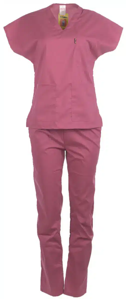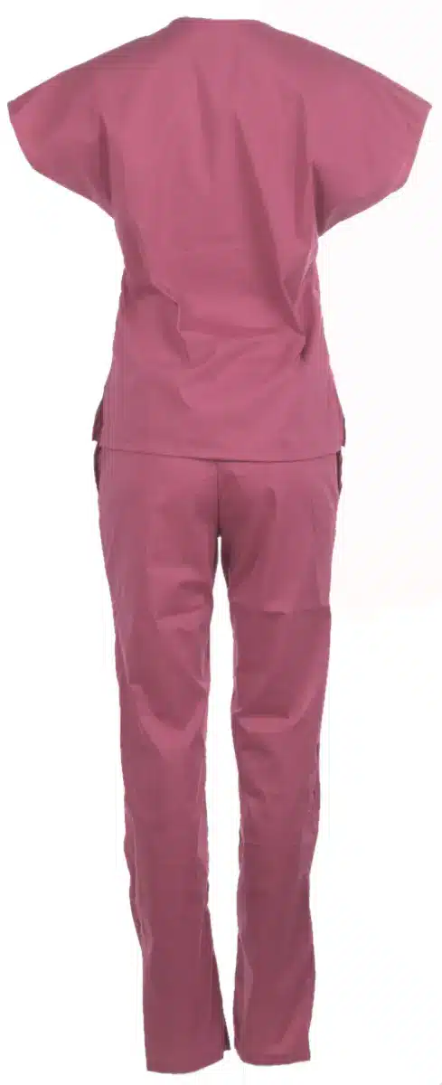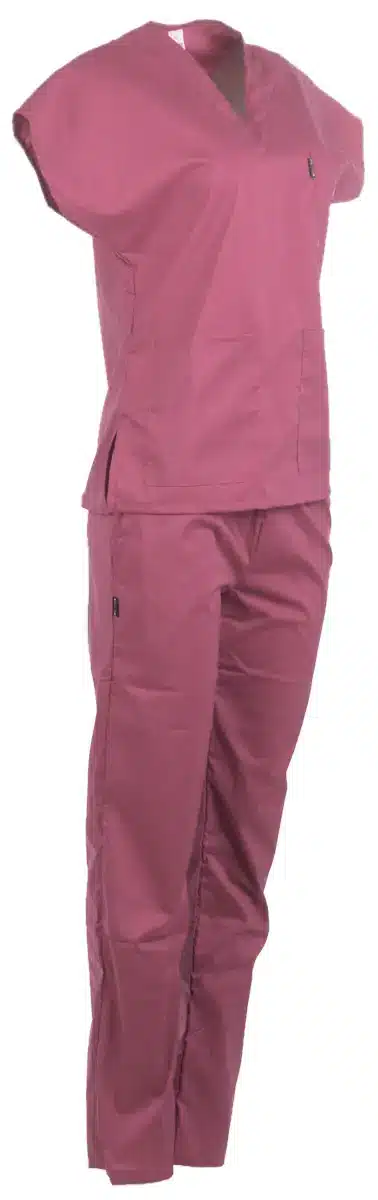 Костюм втален в цвят малина от две части. Комплектът се състои от туника с къс ръкав и дълъг панталон с елегантен втален силует. Изработен е от мек еластичен плат, който е изключително лесен за поддържка. Туниката е с вталена кройка, къси паднали ръкави и остро деколте. Снабдена е с три джоба. Има джоб отпред вляво на гърдите и два джоба в долната част. Осигуряват ви достатъчно място за съхранение на служебните инструменти и личните аксесоари. Функционалните джобове правят туниката практична и удобна за ежедневна употреба. За повече удобство панталонът има ластик с връзки в кръста и два италиански джоба.