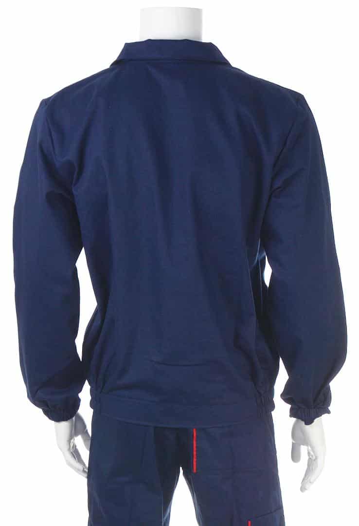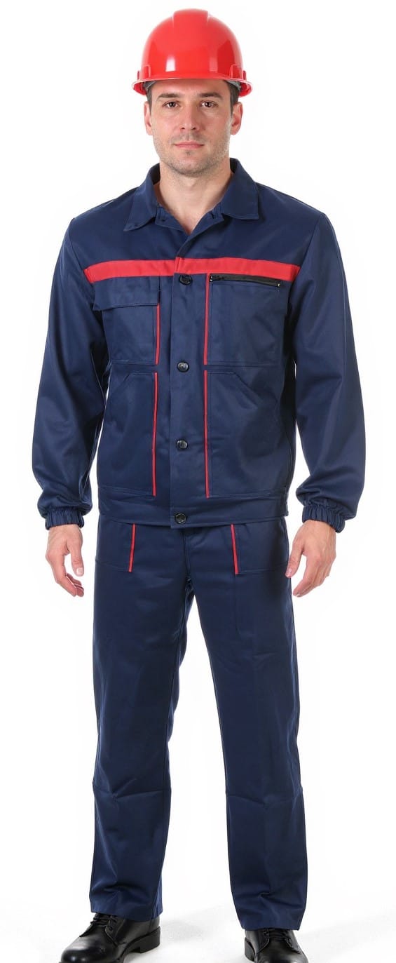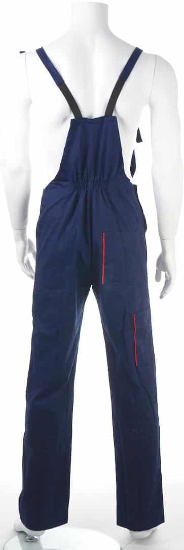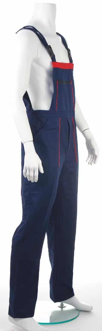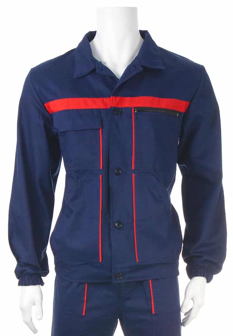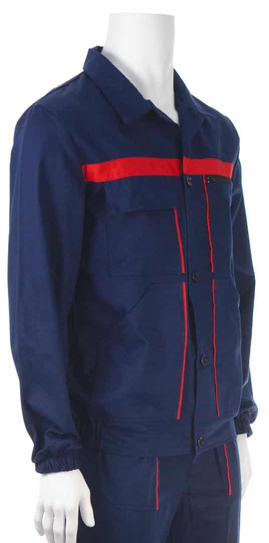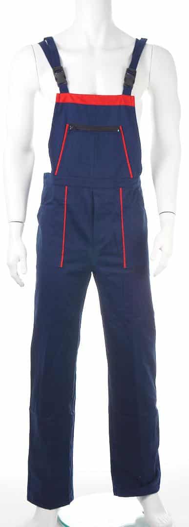 Работен костюм яке и полугащеризон в тъмносин цвят с червена гарнитура. Платът е смес от памук с полиестер с плъстност 240 г/м2.
