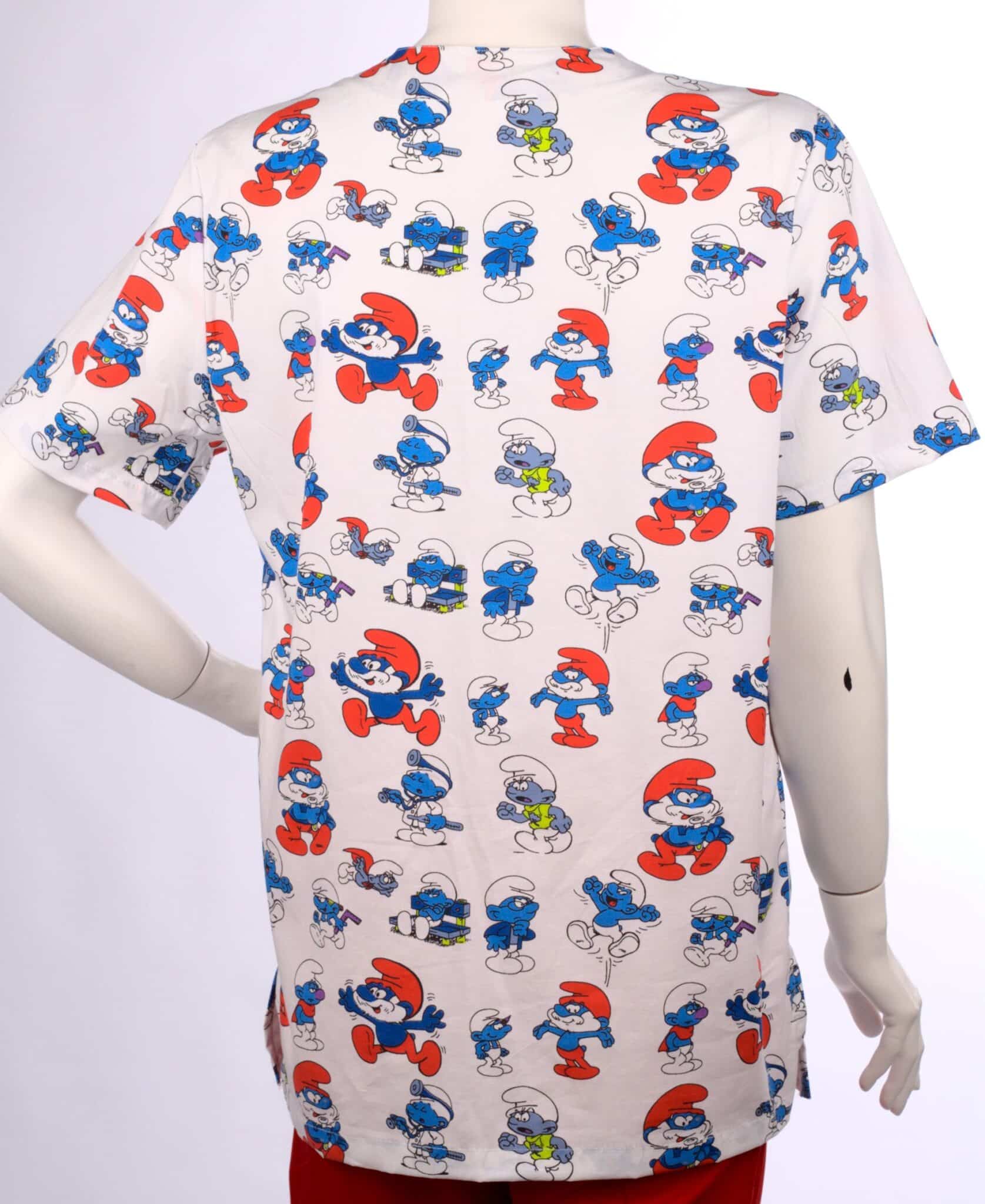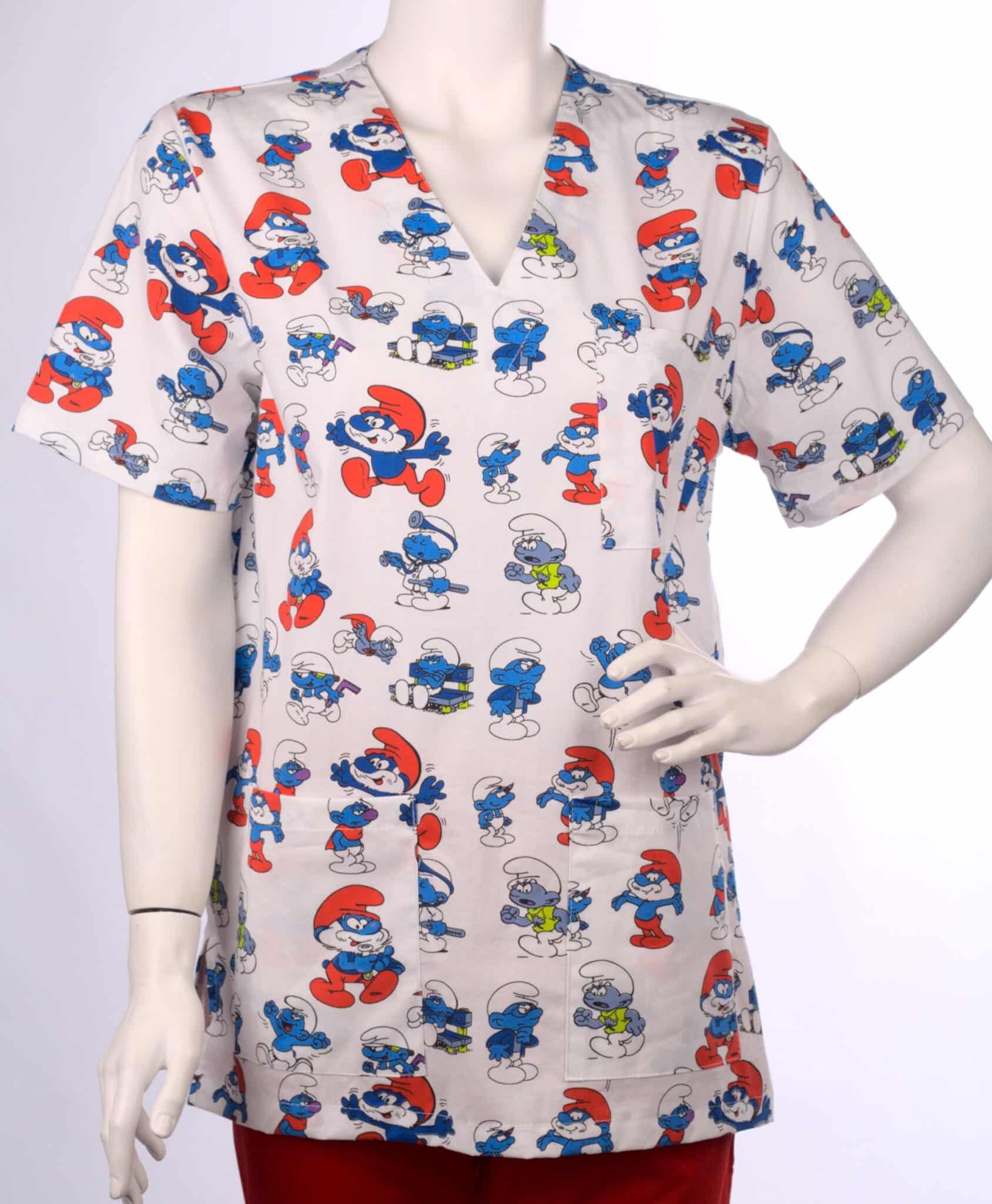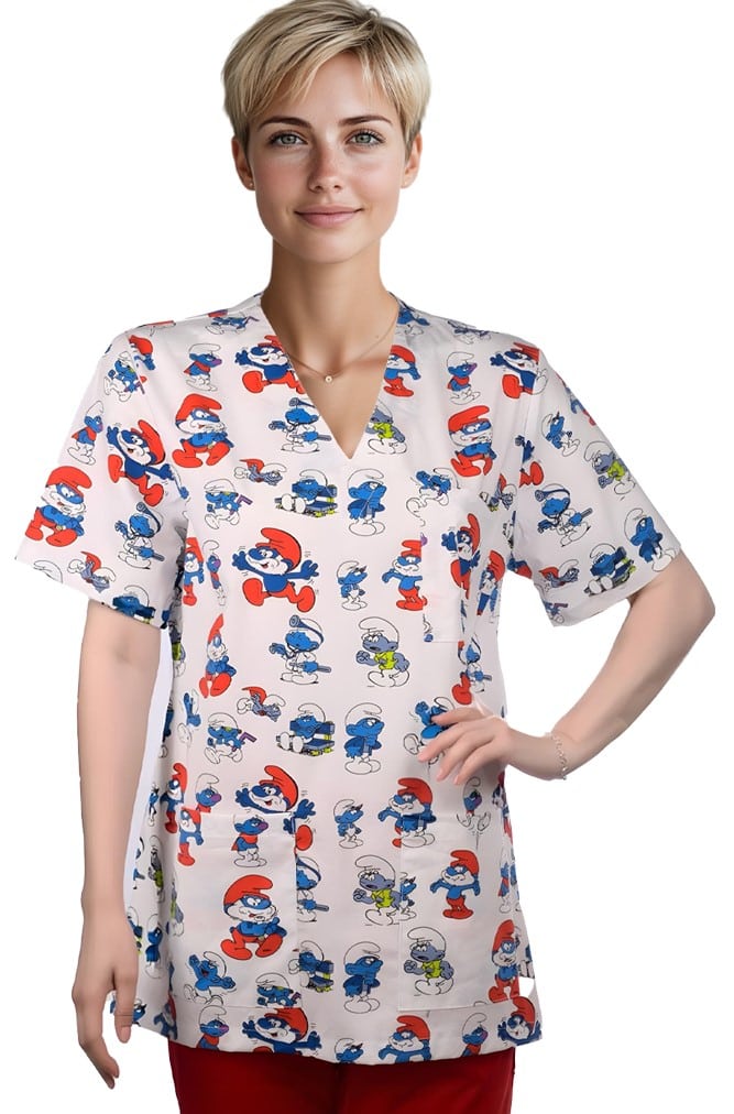 Медицинска туника унисекс с щампа Смърфове. Моделът е универсален, което го прави еднакво подходящ за жени и за мъже. Изработен е от плат с високо съдържание на памук. Това гарантира, че няма да ви запари през дългите часове работа. Препоръчително е да се има предвид, че при пране на високи температури, туниката може да се свие. При избор на размер от тази туника е добре да се спрете на един, или два размера по-голяма туника. Туника унисекс с щампа Смърфове е подходящо облекло за медицински работници, персонал в детски ясли и градини. Също и за фризьорски салони и козметични студиа. За завършена работна униформа можете да съчетаете този модел с медицинска шапка с щампа Смърфове и кърпа за уста с щампа Смърфове. На снимката туниката е съчетана с панталон унисекс в червен цвят.