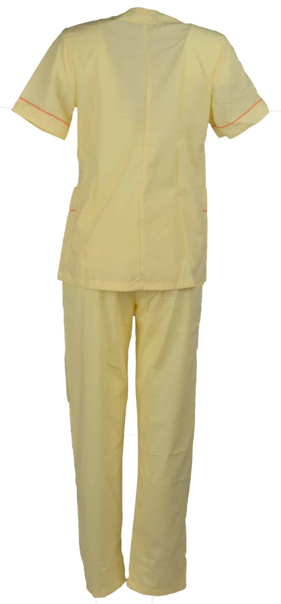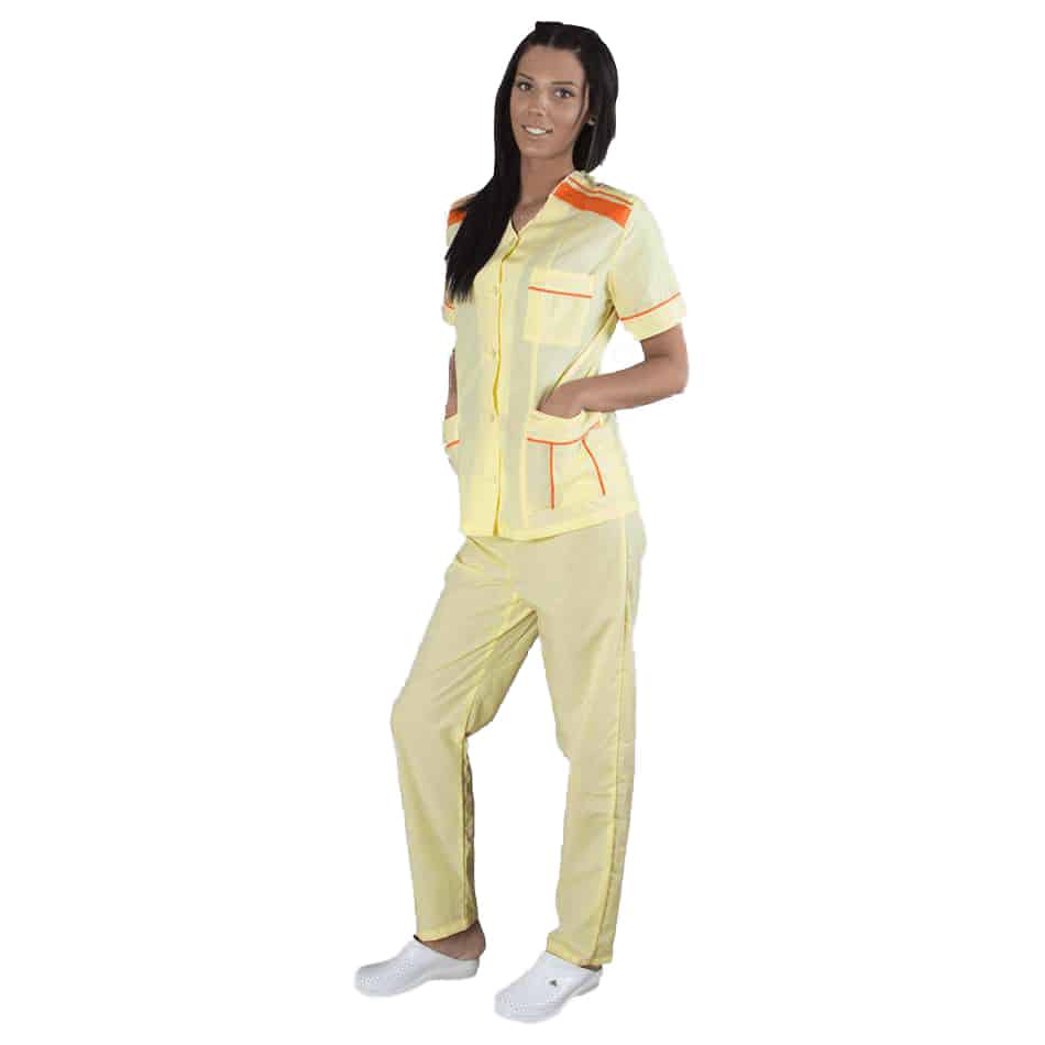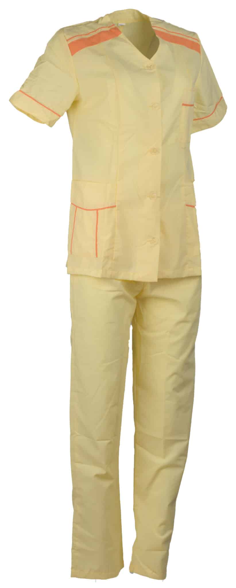 Медицински костюм в светло жълт цвят. Комплекта се състои от туника с къс ръкав и дълъг панталон в същия цвят. Туниката е с права кройка и V-образно деколте. Закопчава се с копчета отпред. Има 2 джоба в долната част отстрани и 1 джоб в горната лява част. Добавени са елемени в оранжев цвят върху джобовете, в края на ръкавите и в горната част около областта на раменете. Панталонът е с права кройка и ластик на кръстта. Медицински костюм жълт е изработен от памук/полиестер.