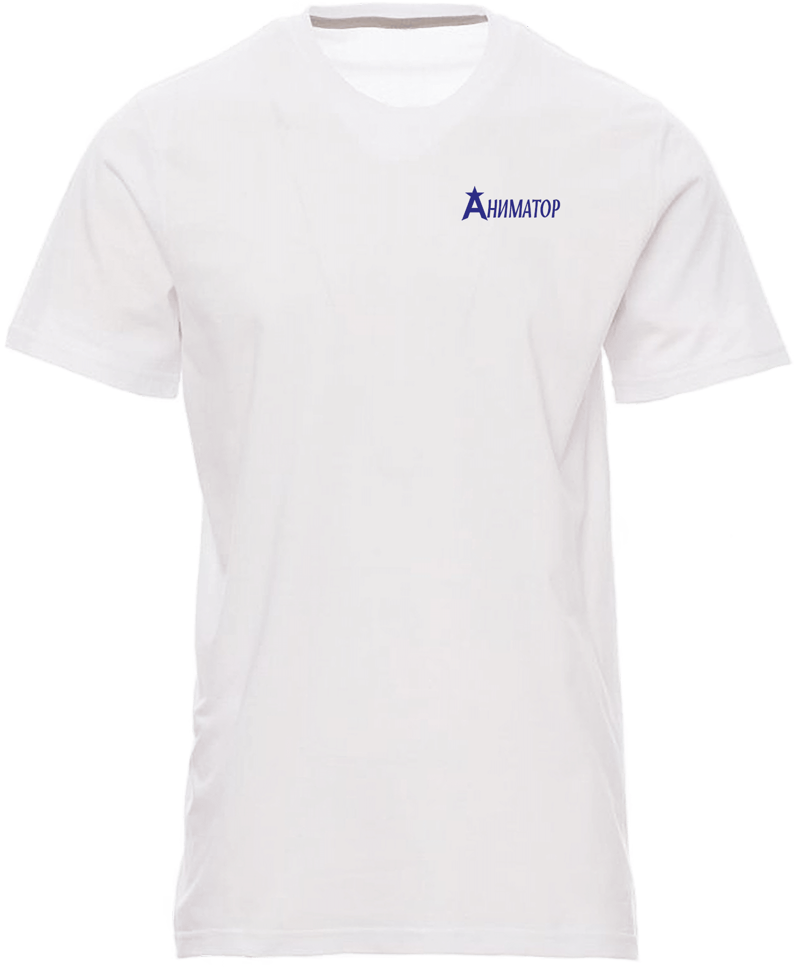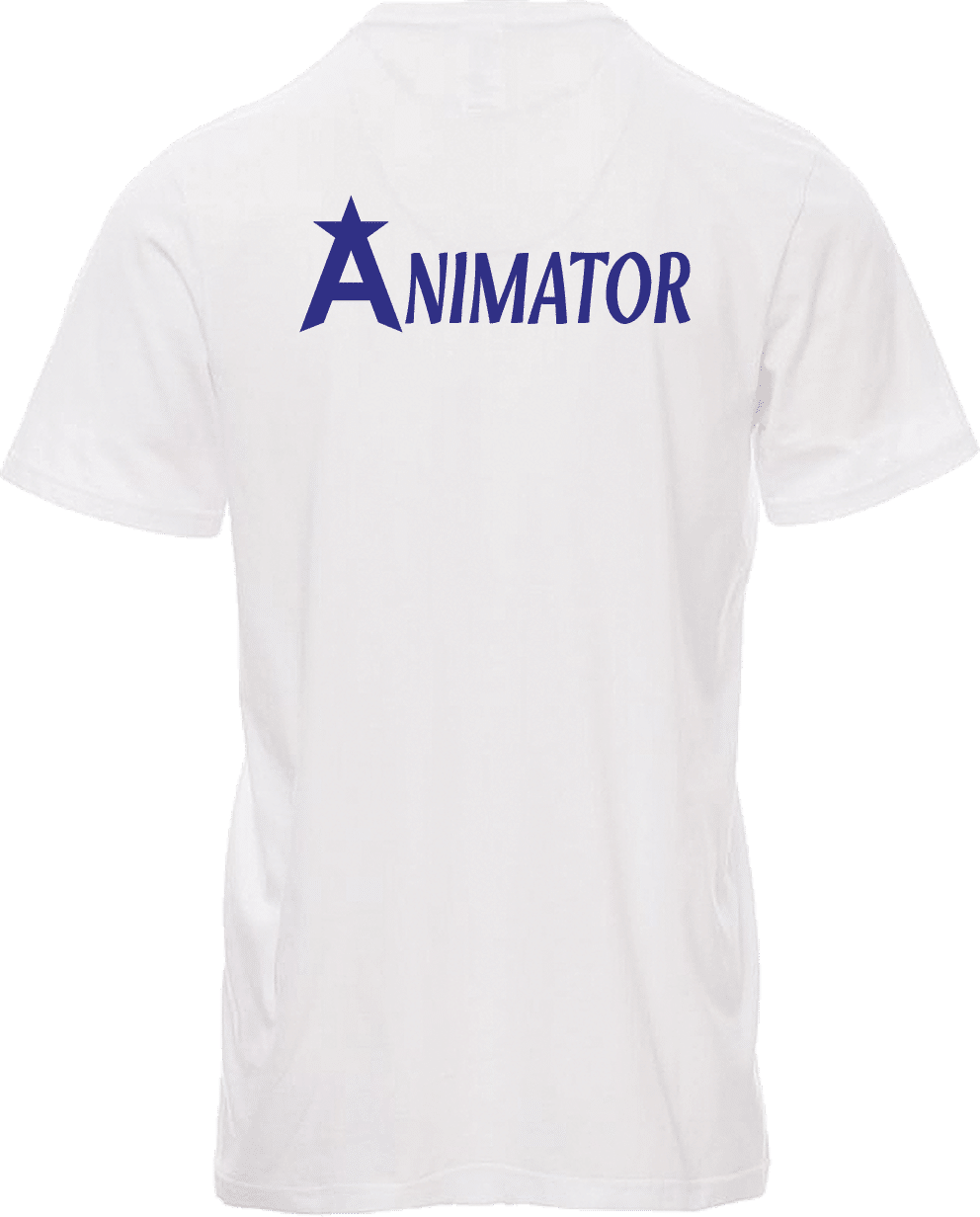 Бяла мъжка тениска с къс ръкав с надпис Аниматор. Материята на тениската е 100% памук, а изображението е изработено чрез пълноцветен дигитален печат. Тениската можем да изработим също и в дамски вариант
