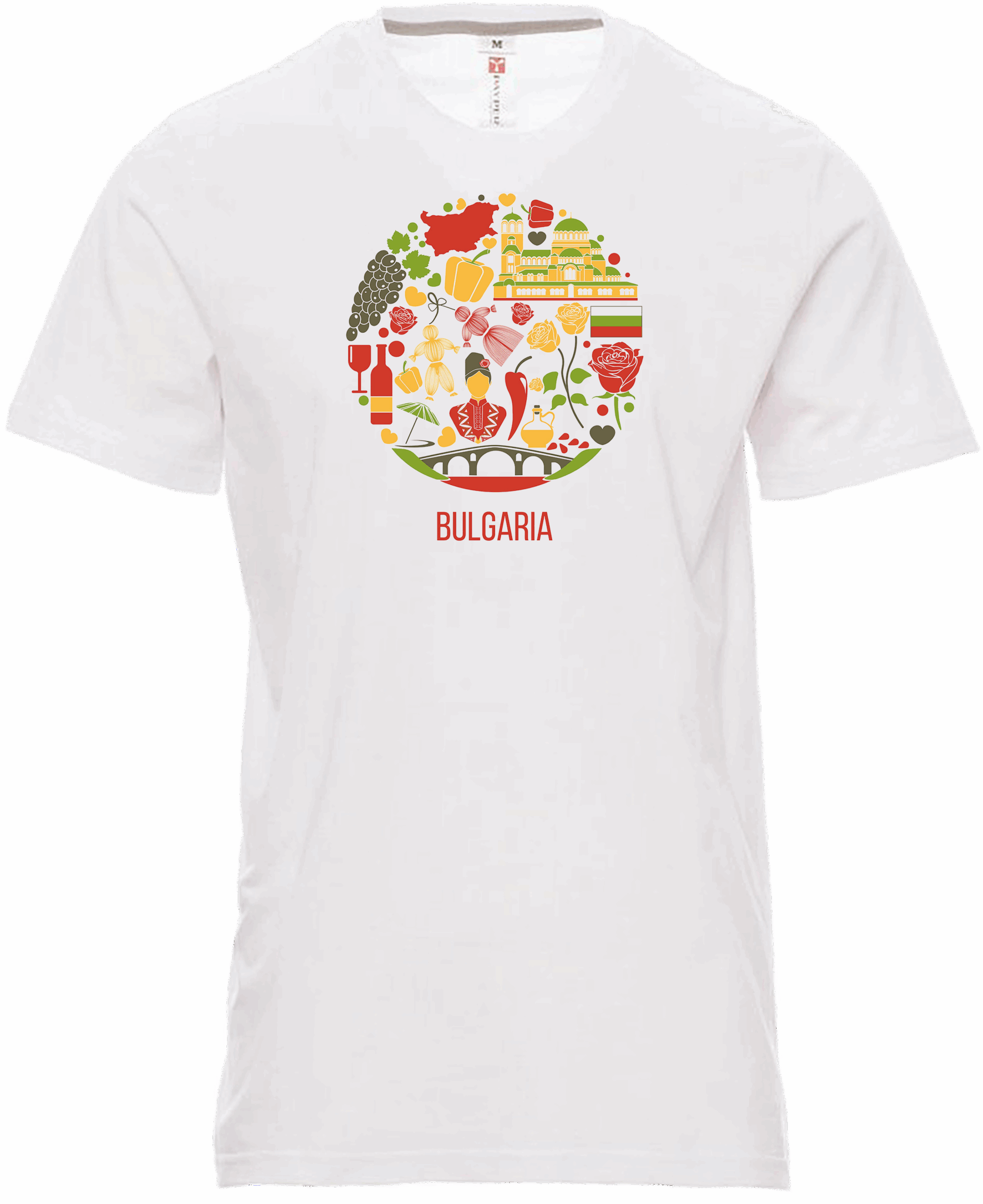 Мъжка бяла тениска с дигитален печат тематично изображение и надпис България. Мека и много удобна, тениската е отличен избор на облекло за летните горещини. Можете да я изберете както за работна униформа, така и за лична употреба в ежедневието. Можем да изработим мъжка тениска България и в друг цвят по избор на клиента. Разгледайте всичките ни предложения за мъжки тениски, за да изберете цвят различен от бял. Този модел предлагаме също и в дамски вариант.