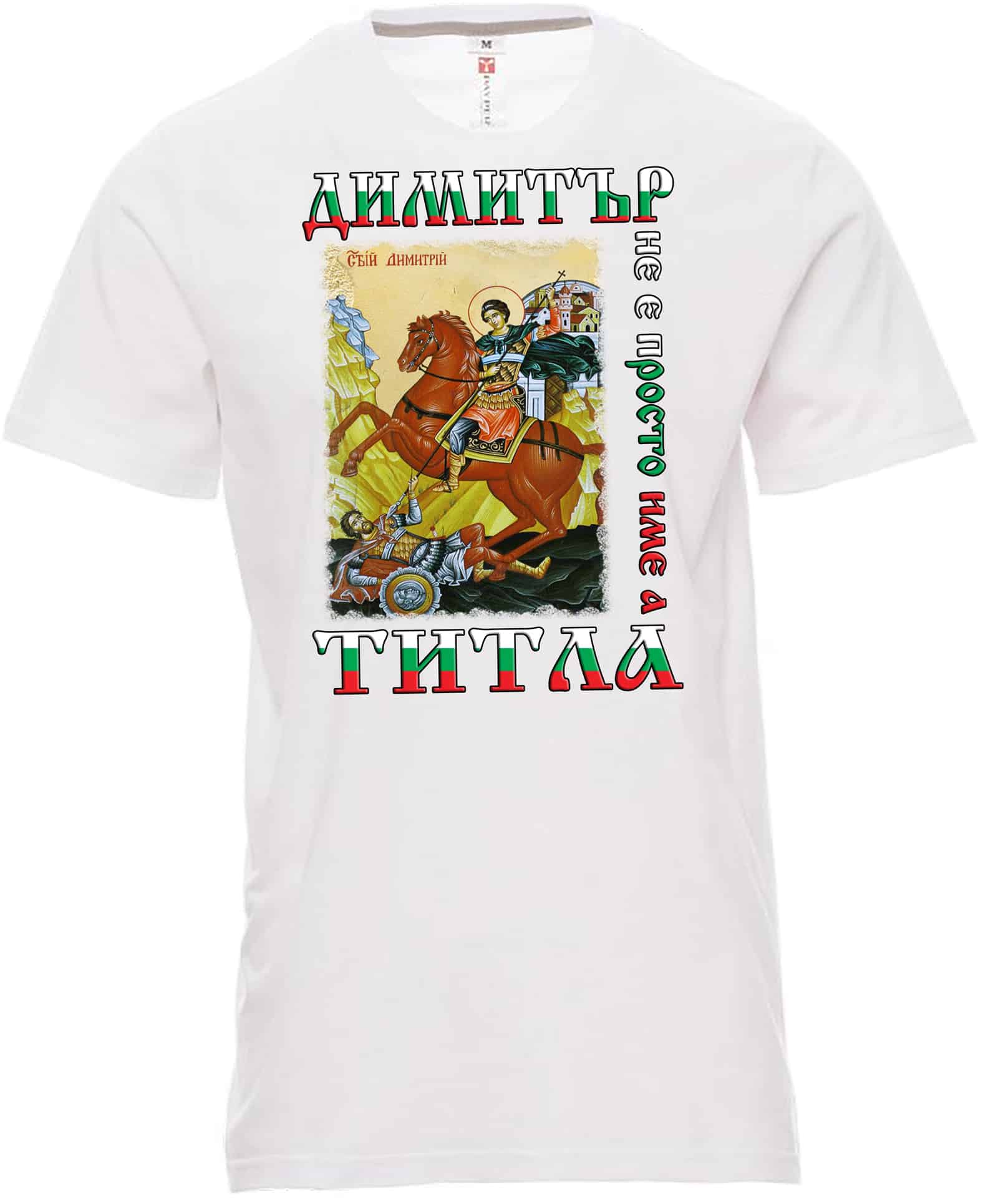 Мъжка бяла тениска с къс ръкав с дигитален печат Димитър. Материята на тениската е 100% памучна и много мека. Този модел е чудесен за подарък по повод Димитровден, или без повод. Освен бяла, можете да поръчате и цветна мъжка тениска Димитър. Разгледайте предложенията ни за цветни мъжки тениски. Преди поръчка на цветна тениска с печат, е добре да ни потърсите за справка относно наличните размери. Печат за Димитровден можем да изработим и върху детска тениска.