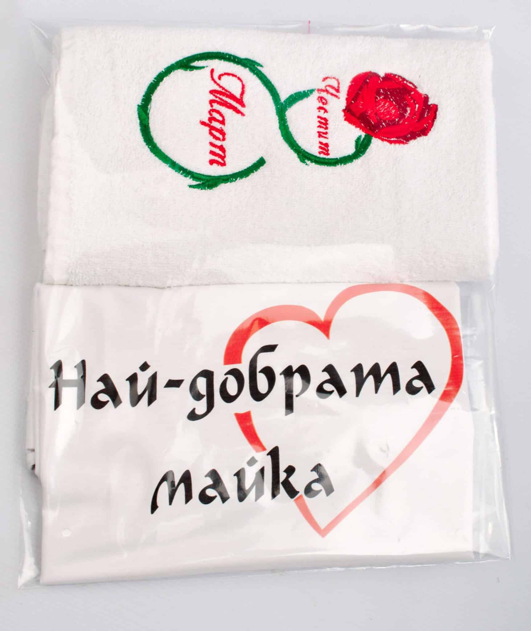 Подаръчен комплект 2 кърпи за 8-ми март. Състои се от две бели хавлиени кърпи от 100% памук с размер 50/90 см с  компютърна бродерия. Върху кърпите са бродирани надпис Най-добрата майка с червено сърце и роза с надпис Честит 8-ми март. Двете кърпи могат да се поръчат и по отделно, на индивидуални цени. Подаръчен комплект 2 кърпи за 8-ми март можете да подарите и на госпожите в ясли или детските градини.