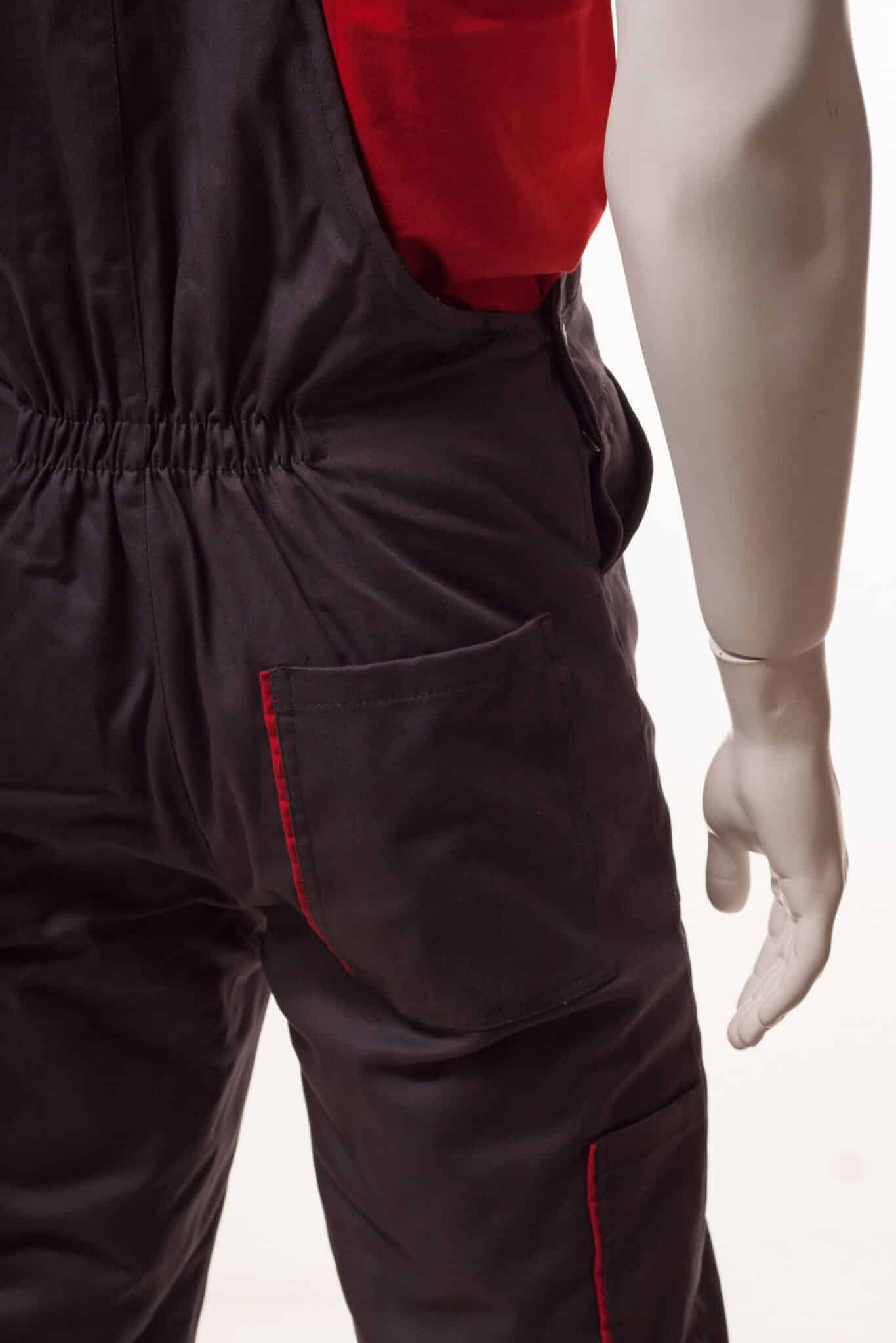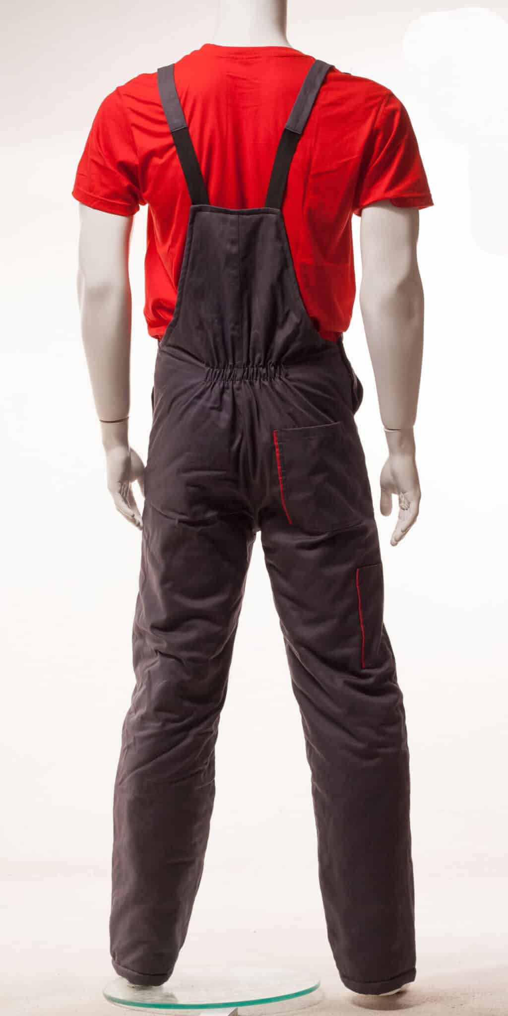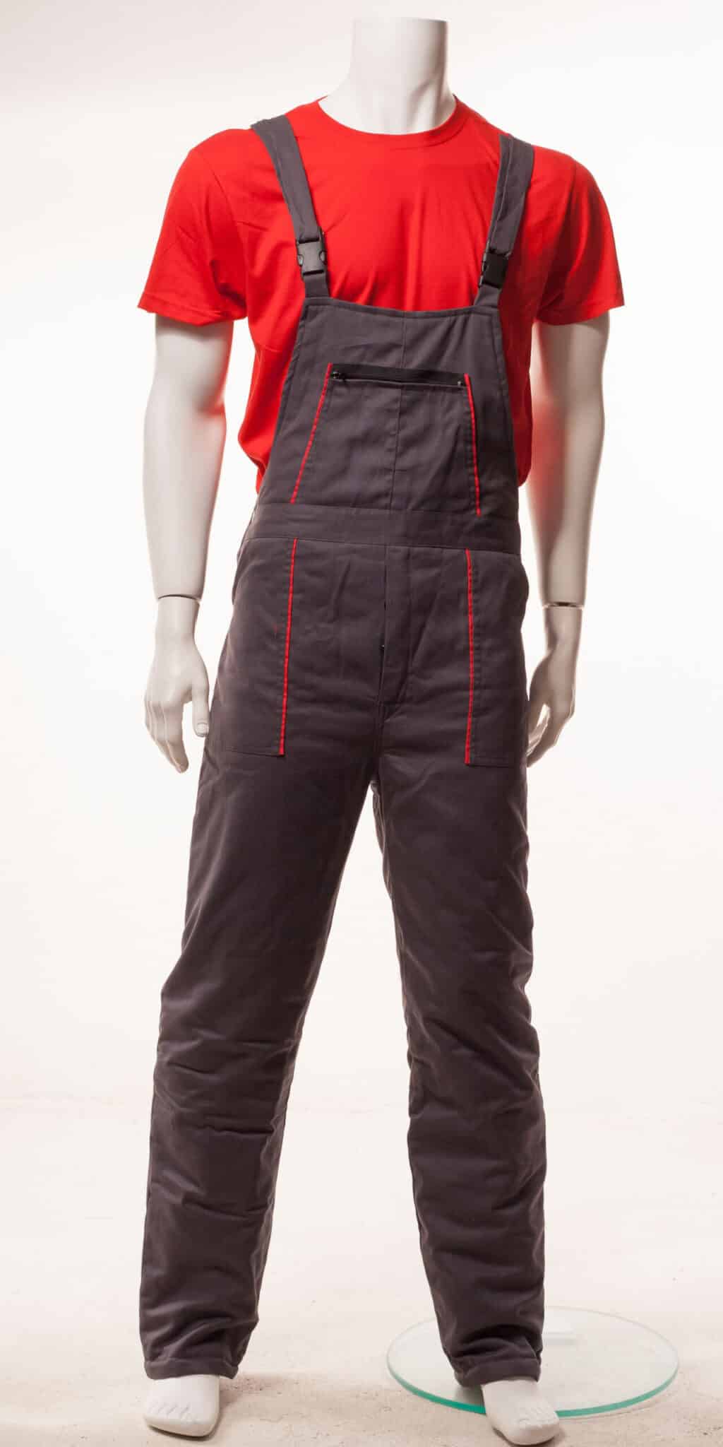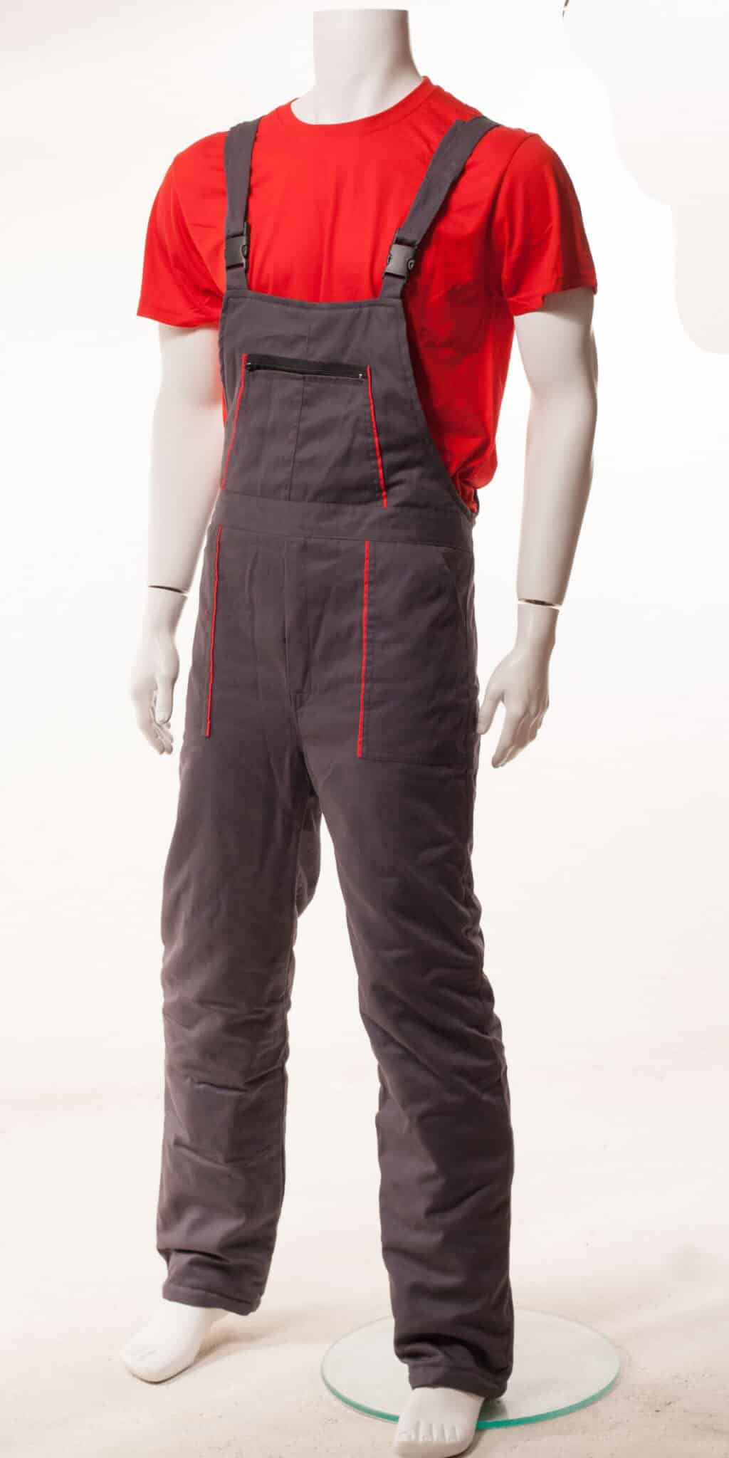 Ватиран полугащеризон със състав 100% памук в сив цвят с червени елементи. Този работен зимен полугащеризон е с регулируеми ластични презрамки. Има ластик на кръста в задната част. Предвидени са няколко джоба: един голям на гърдите, два странични, един заден и един инструментален на крачола.