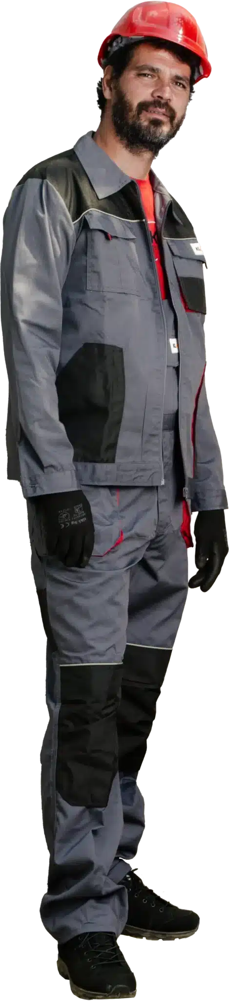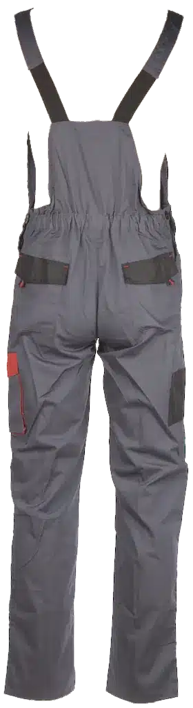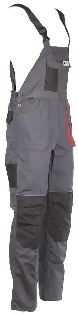 Работен полугащеризон модел KL4YOU от материя рипстоп в сиво и черно с червени елементи. Моделът има регулируеми презрамки, джоб за наколенки с велкро и светлоотразителни ленти в областта на коленете. Снабден е с общо девет джоба, от които пет имат капаци с велкро. Талията е ластична в задната си част, а встрани има по две копчета. Опред по средата гащеризонът може да се разкопчава с цип. Полугащеризон рипстоп KL4YOU е отличен избор на всесезонно работно облекло а цената му е много изгодна. От същата серия може да закупите от нас също така яке и панталон рипстоп, както и панталон стреч.