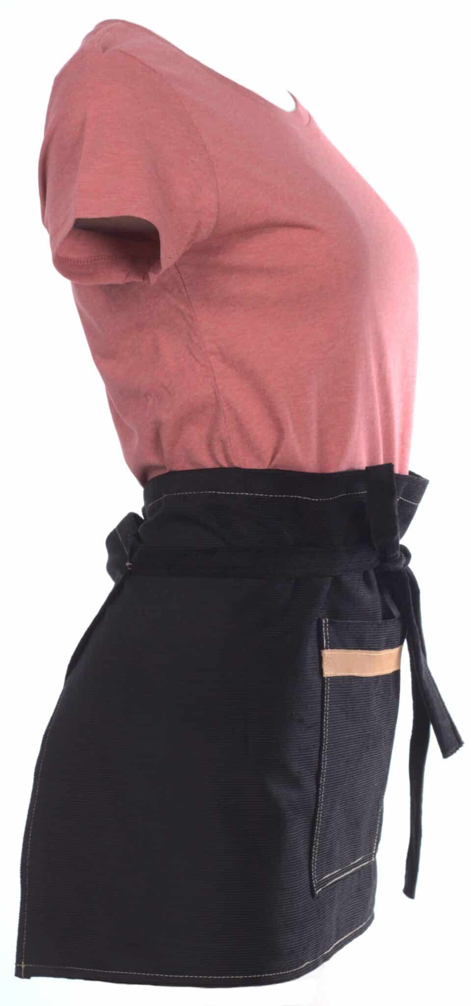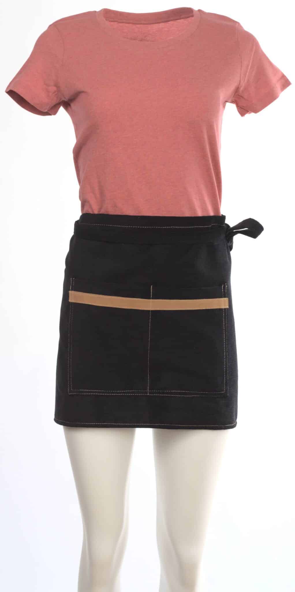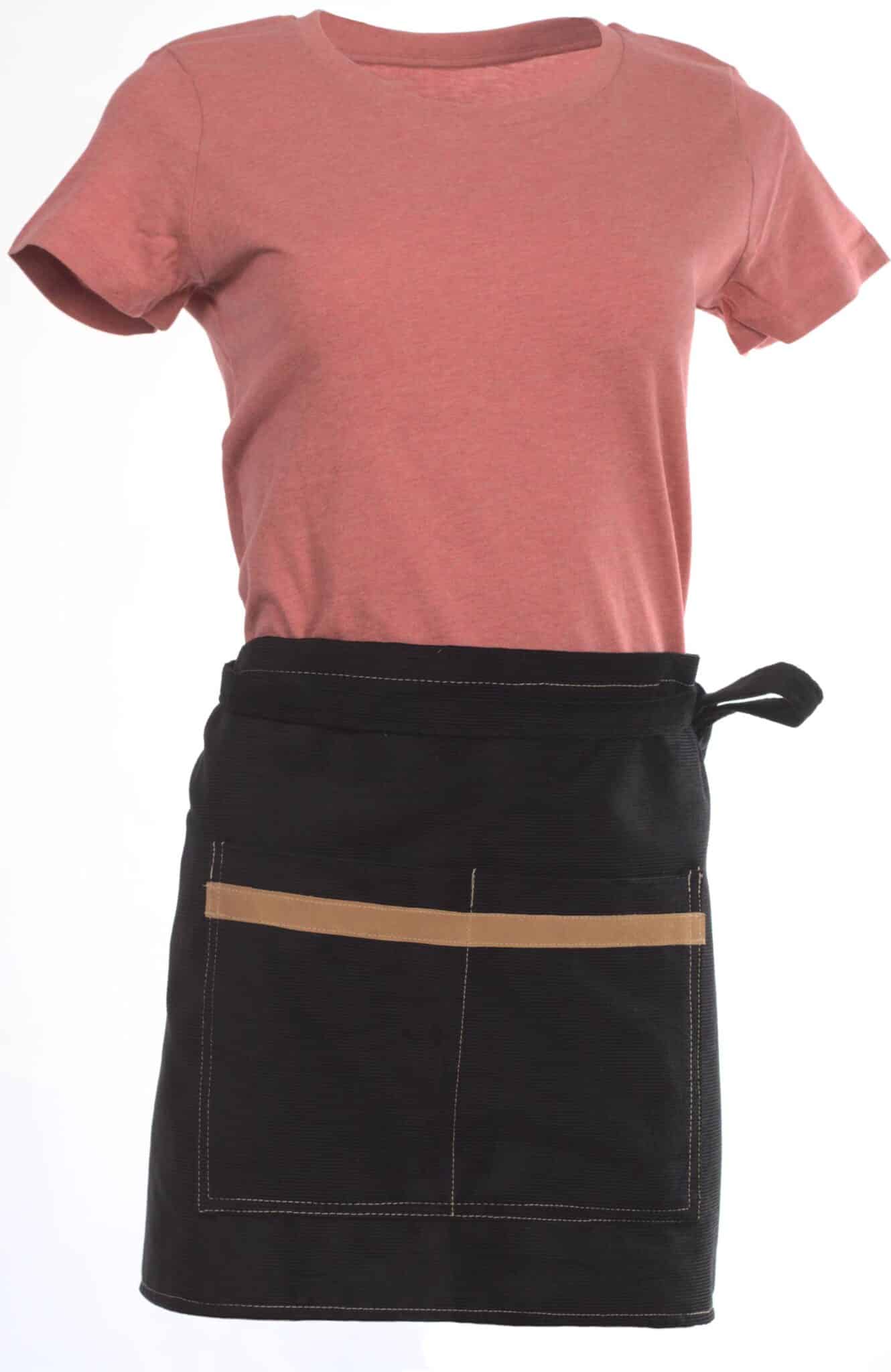 Престилка предница къса кадифе в черен цвят с декоративни елементи в кафяво от еко кожа. Престилката е изработена от джинсов плат със сътав 100% памук, като има и допълнителен подлепващ слой против разтягане на материята. Моделът е с универсален размер, а широчината може да се регулира с помощта на връзки на кръста. Отпред по средата има два съединени помежду си джоба, всеки с приблизителни размери 14 х 20 см. Престилка предница къса кадифе е изключително подходящ аксесоар към работната униформа на сервитьори, фризьори, козметички, цветари, сладкари или продавачи в магазин за хранителни стоки.