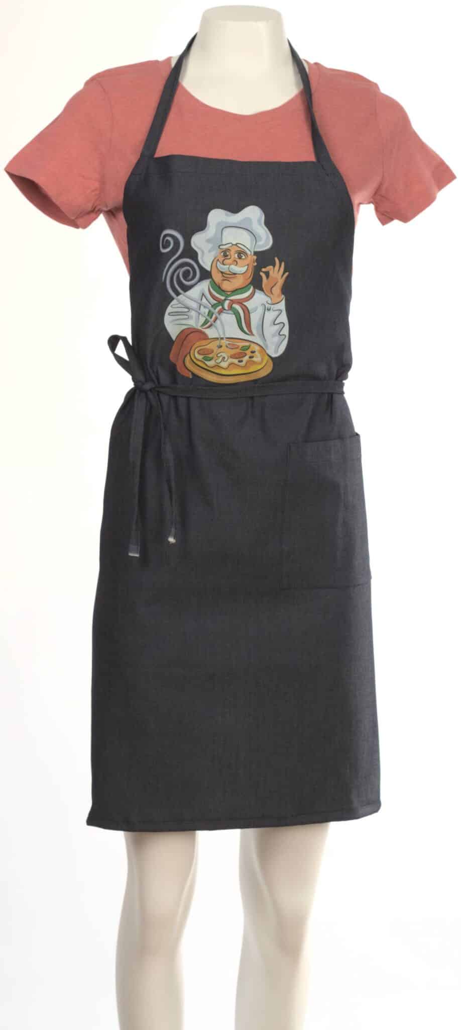 Престилка през врата дънкова с тематичен DTF печат за пицария. Моделът е унисекс с универсален размер. Престилката е изработена с два джоба отпред, съединени по средата. Широчината й може да се регулира с помощта на връзки на кръста. Печатът е изработен чрез DTF технология. Качеството на отпечатъка е изключително прецизно и фотореалистично. Тази технология позволява на ресторантите и хотелите да създадат персонализирани униформи за своя персонал, които да бъдат удобни, издръжливи и в същото време стилни. Престилка през врата дънкова – пицария, е един прекрасен завършващ елемент от работния екип на персонала.