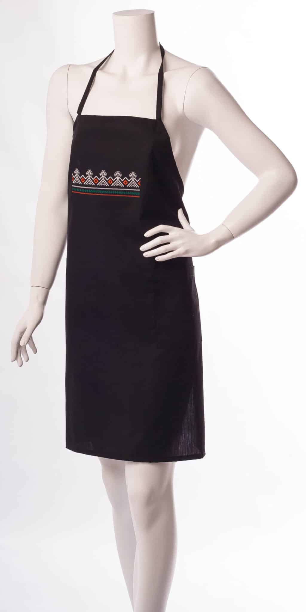 Престилка през врата черна на цвят с бродерия фолклорен мотив – шевица. Моделът има връзка през врата, голям джоб по средата и дълги връзки през кръста за регулиране на широчината. Еднакво подходяща е за мъже и за жени. Леката материя на плата гарантира проветривост и комфорт на движенията. Лесна е за почистване и изсъхва бързо след пране. Глади се без усилие. Престилка през врат – черна с шевица изработваме още в бял и в червен цвят. Бихме могли да изработим престилки и в различни от показаните в сайта цветове, като цената ще се промени. Потърсете ни за справка.