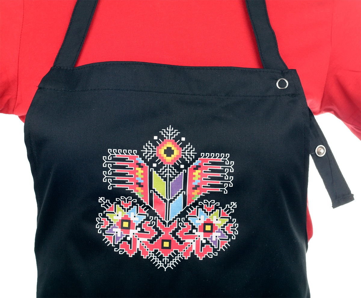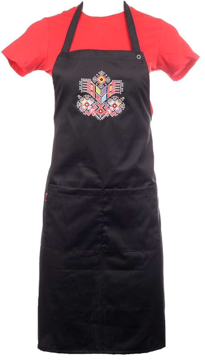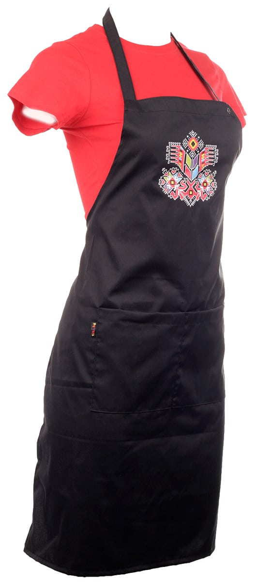 Черна престилка през врат с шевица, закопчава се с тик-так копчета и има възможност за регулиране на дължината. Изработена е от плат с плътност 160 гр., комбинация от памук и полиестер. Шевицата е Дървото на живота – авторска разработка на талантливата Елисавета Йорданова. В допълнение към престилката може да поръчате от нас и готварска шапка  с шевица.