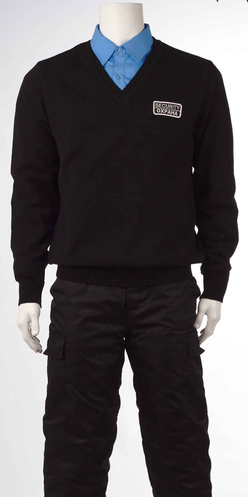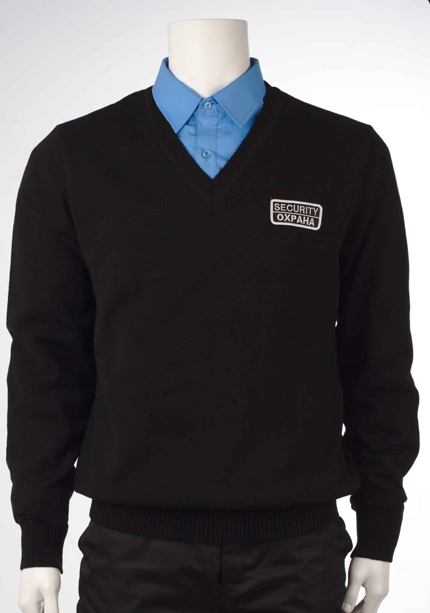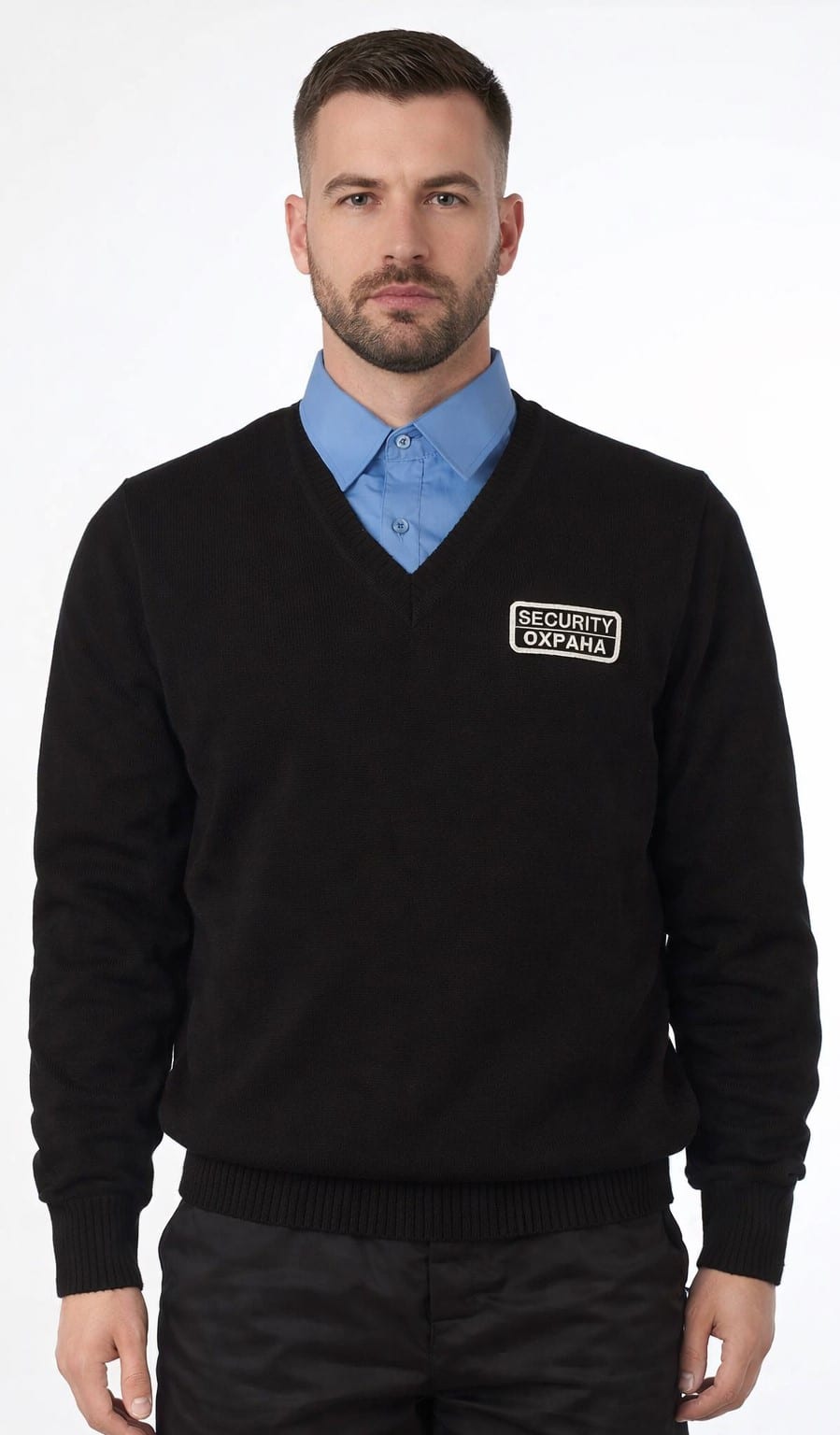 Стилен черен пуловер за охранители от акрил, произведен в България. Моделът има лека еластичност. Подходящо допълнение е към зимната работна униформа за охранители. Професионален избор за фирми, които държат на унифициран външен вид и комфорт по време на работа.