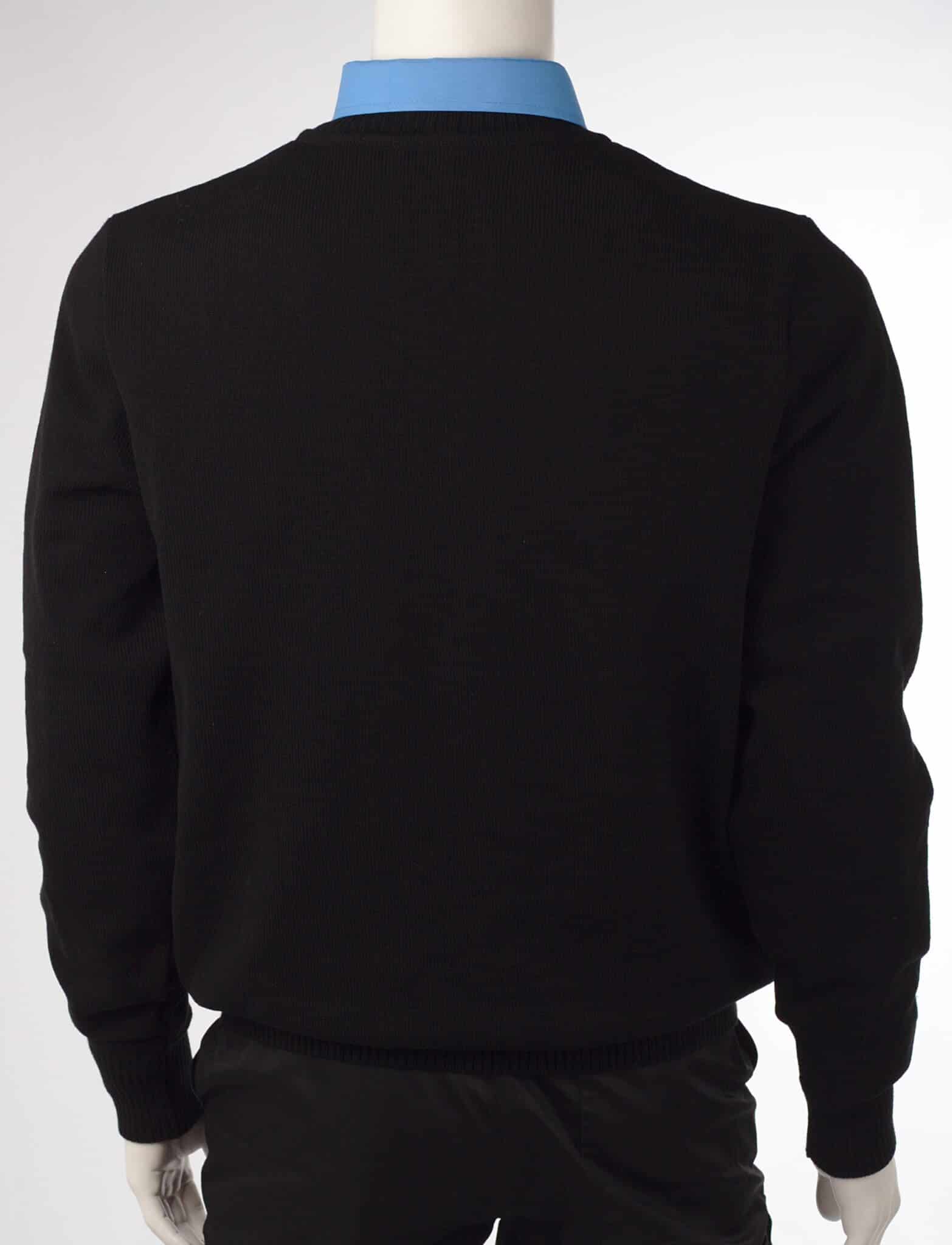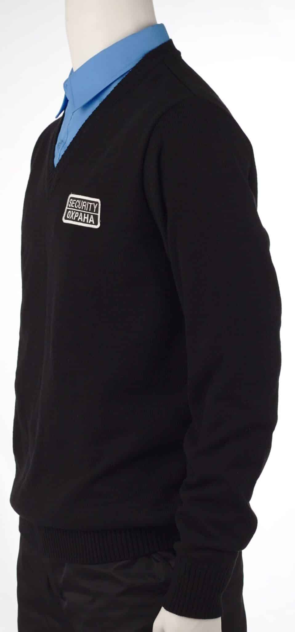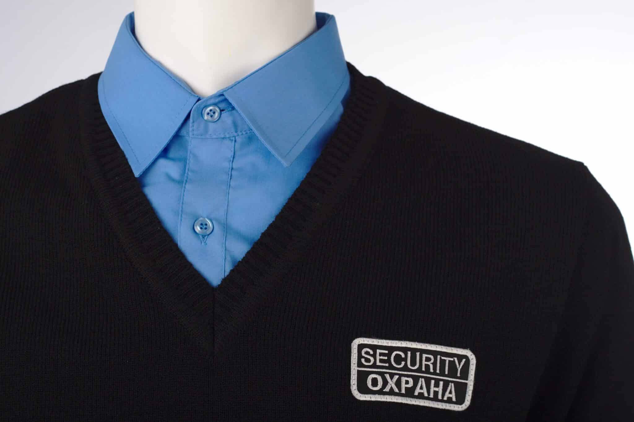 Стилен черен пуловер за охранители от акрил, произведен в България. Моделът има лека еластичност. Подходящо допълнение е към зимната работна униформа за охранители. Професионален избор за фирми, които държат на унифициран външен вид и комфорт по време на работа.