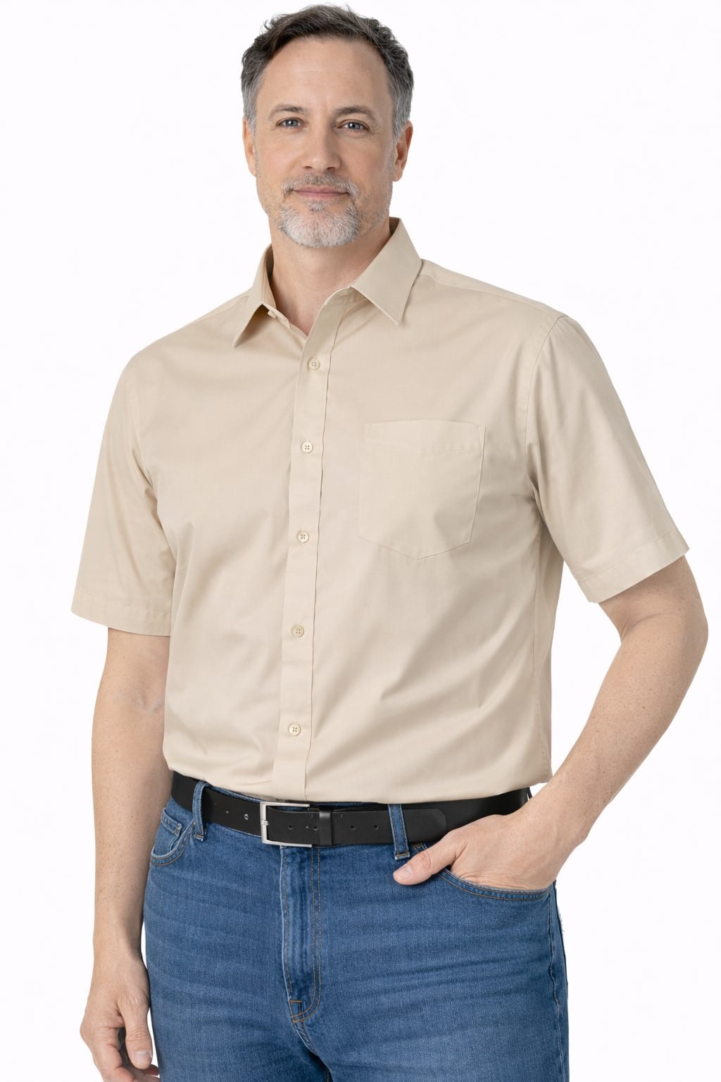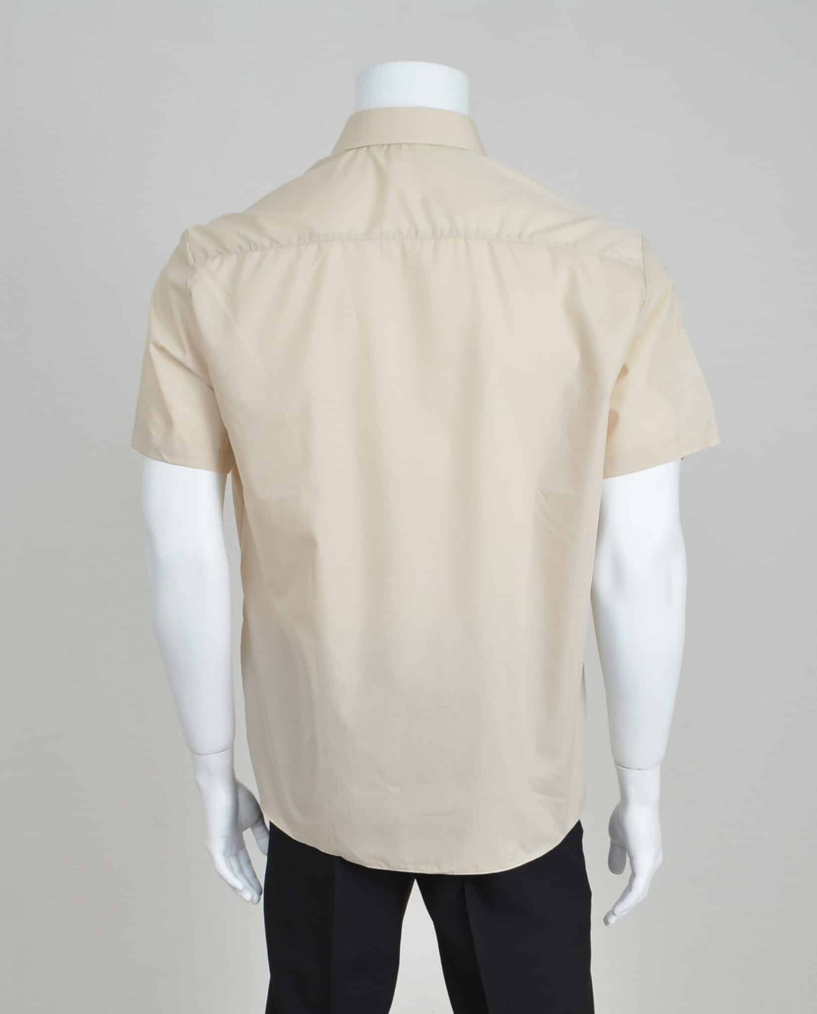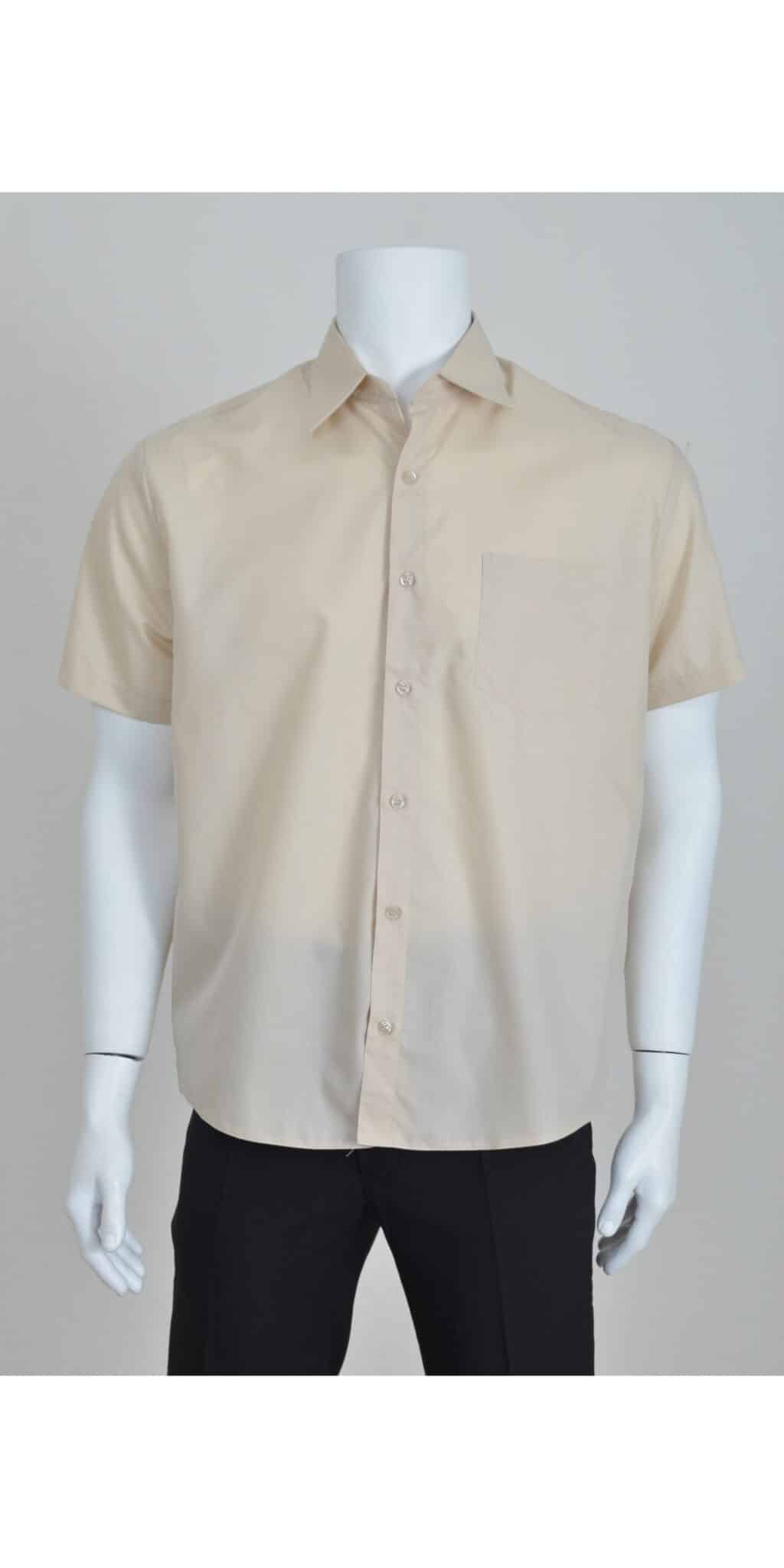 Класическа риза мъжка с къс ръкав, бежова на цвят. Изработена е по стандартна права кройка от плат смес памук с полиестер. Съставът на плата е подходящ за многократно изпиране, изсъхва бързо и е лесен за гладене. Леката материя позволява свободни движения и достатъчна проветривост. Ризата е с едноредово закопчаване и разполага с един горен джоб. Риза мъжка с къс ръкав класик – бежова е изключително подходяща за работно облекло на сервитьори, персонал в ресторант, казино или рецепционист. Клиентите ни имат възможност за изработка на компютърна бродерия с надпис, или лого. Предлагаме също така и брандиране с устойчив DTF печат. Потърсете ни за повече подробности. Всички предложения за официално работно облекло са налични, както онлайн така и в нашите магазин. Може да посетите и някой от физическите ни магазини в страната в Стара Загора, София, Бургас, Слънчев Бряг и Казанлък.