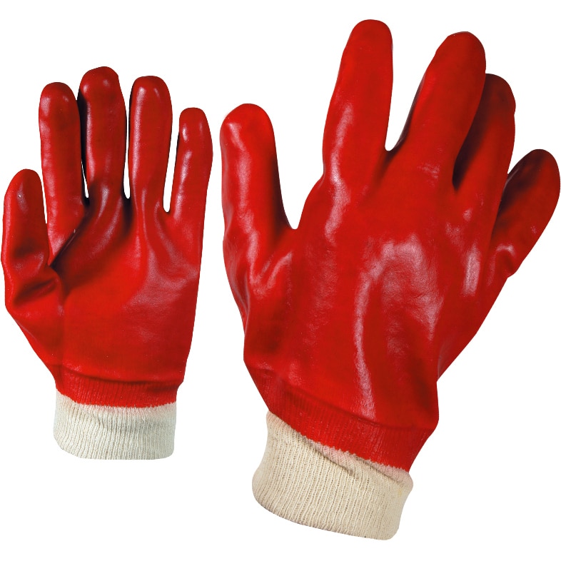 Работни ръкавици от категория маслоустойчиви с маншет. Изработени са от плетено безшевно трико, изцяло топени в PVC. Маншетът е ластичен. Този модел се предлага в червен цвят.