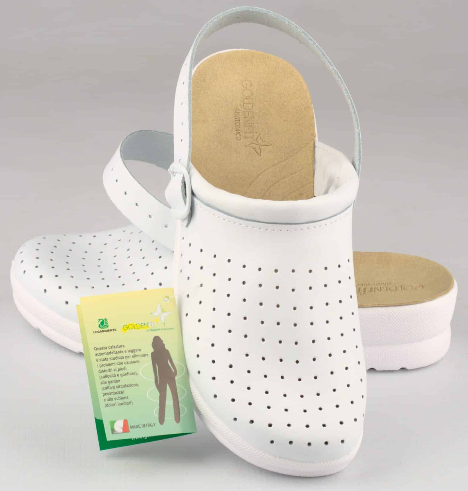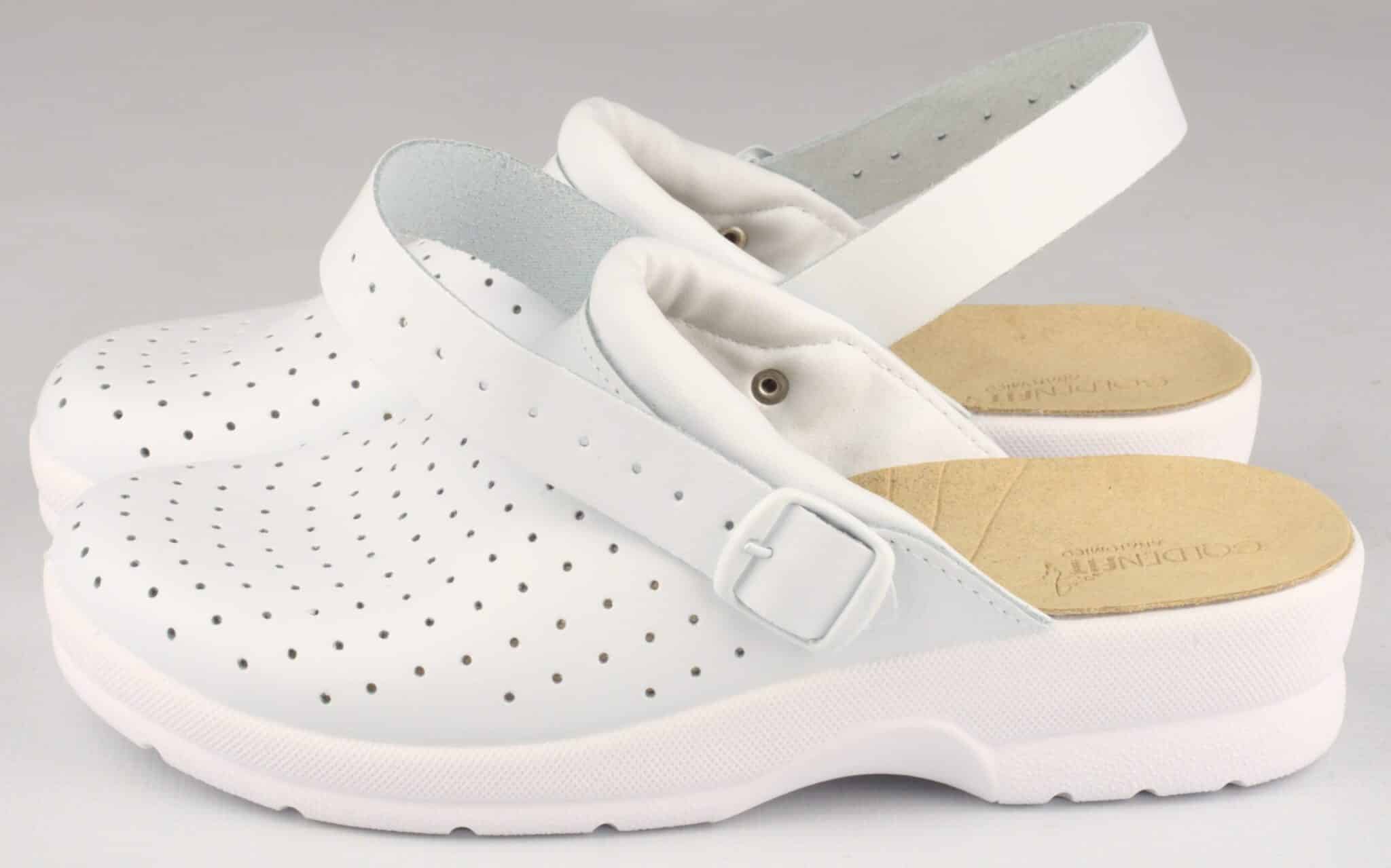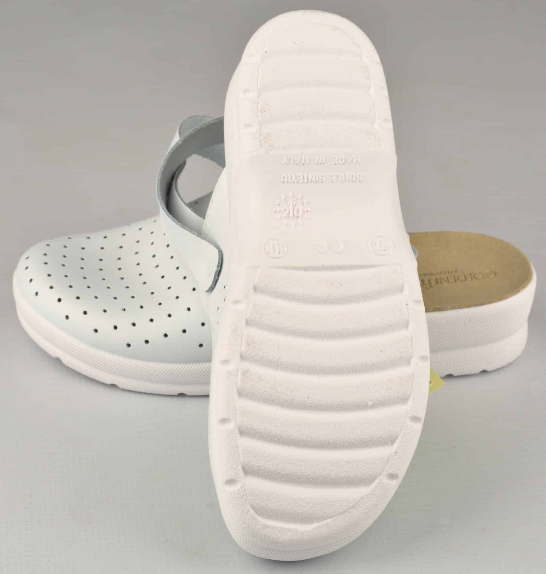 Сабо дамско GF с каишка бяло на цвят, произведено в Италия. Саята и стелката са изработени от естествена кожа. Подметката е полиуретанова и противохлъзгаща. Широчината на каишката може да бъде регулирана. Този модел е много подходящ за работна обувка на служители в медицински заведения, детски ясли и градини, за персонал в кухни, фризьорски и козметични салони и други.