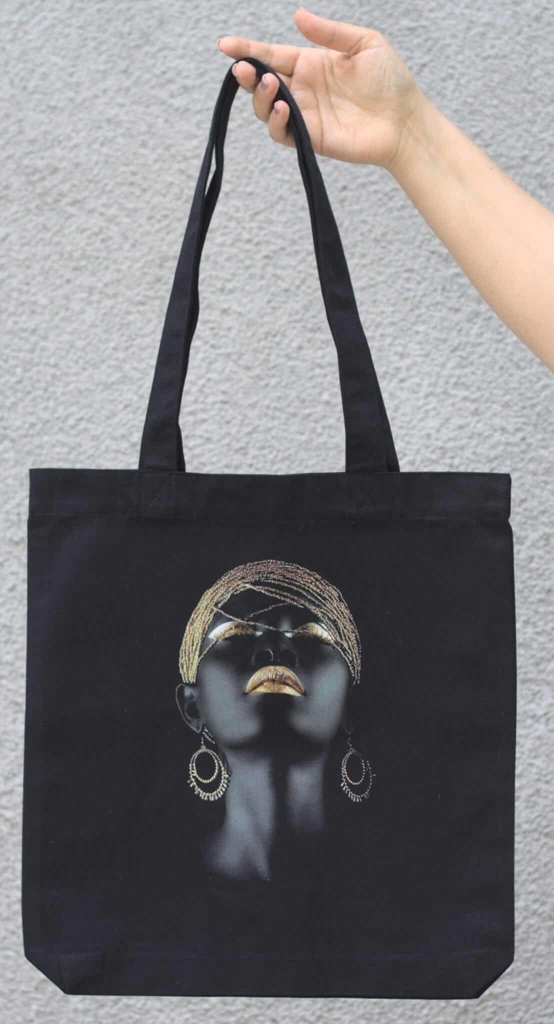 Черна текстилна торба изработена от 80% рециклиран памук и 20% рециклиран полиестер, с пълноцветен дигитален печат Golden Lady. Моделът има две дълги дръжки с подсилени шевове и двойно подгънати краища за по-голяма здравина. Размерът на текстилната торба с печат е универсален, а цветът й е много практичен. Моделът е подходящ за ежедневна употреба. Можете да перете торбата без проблем в пералня, като за целта е нужно да следвате съветите ни, отнасящи се до дигиталния печат: