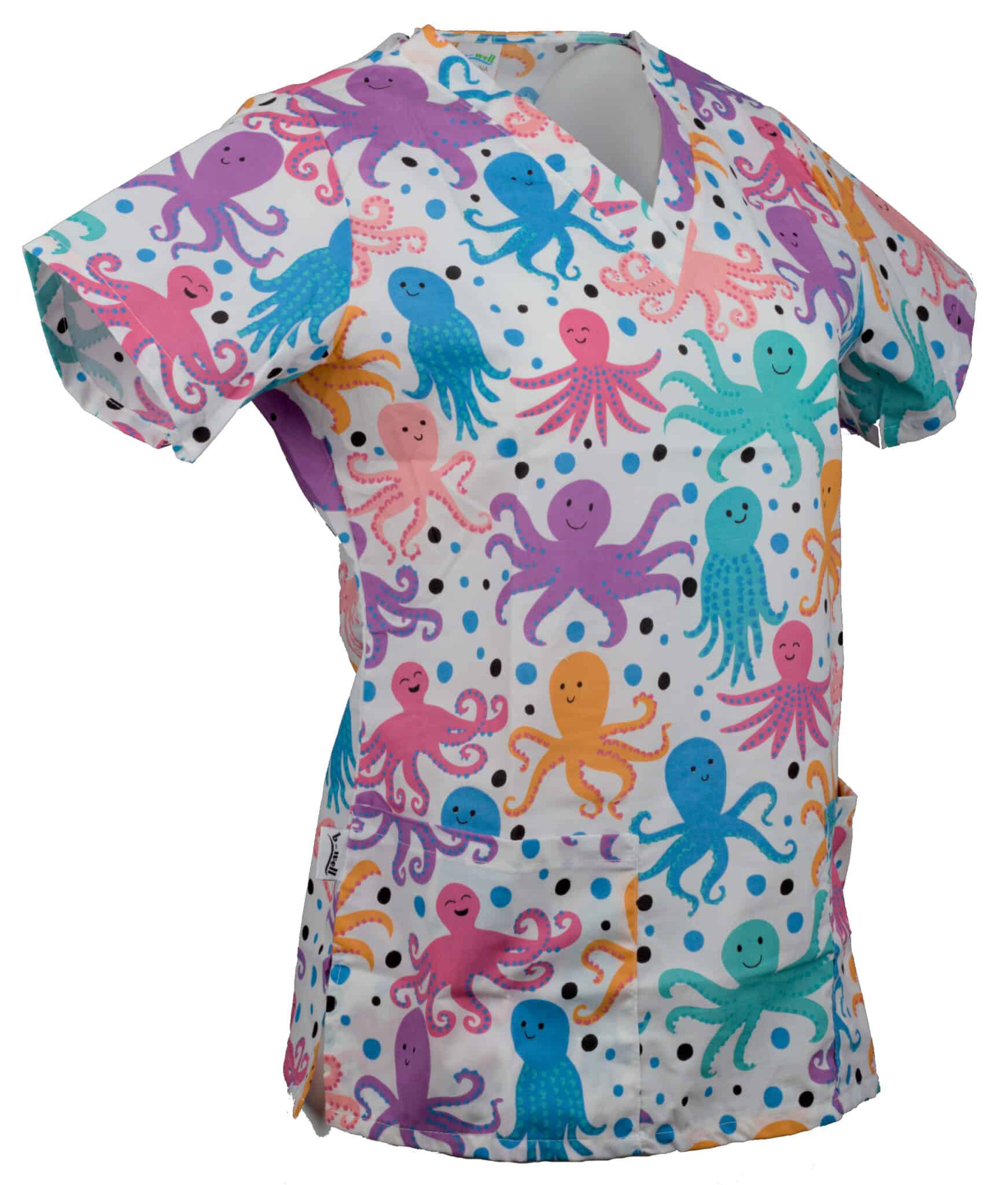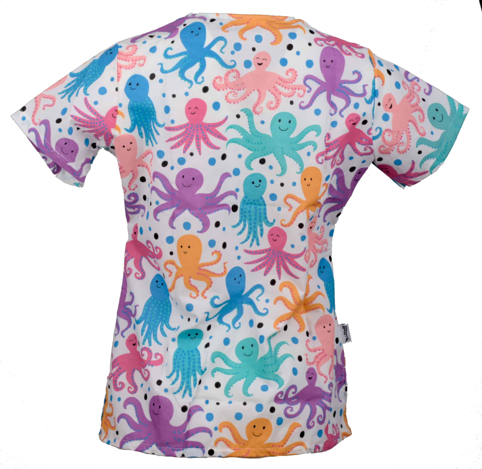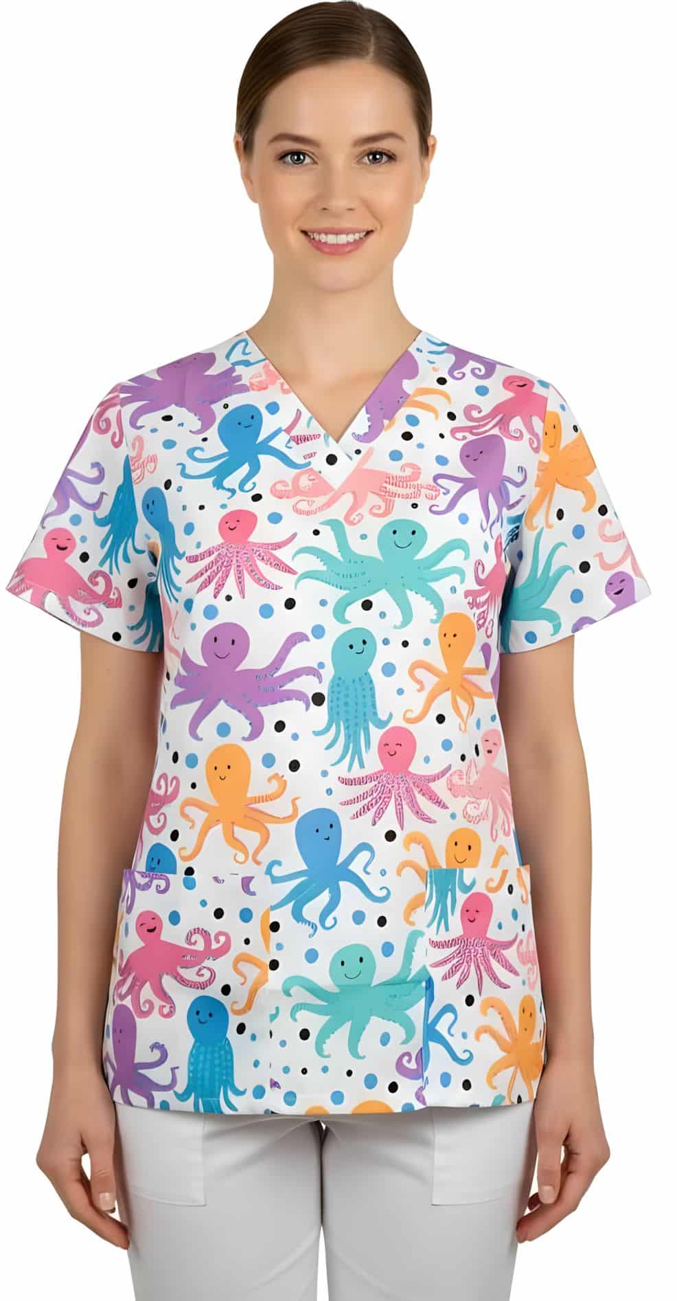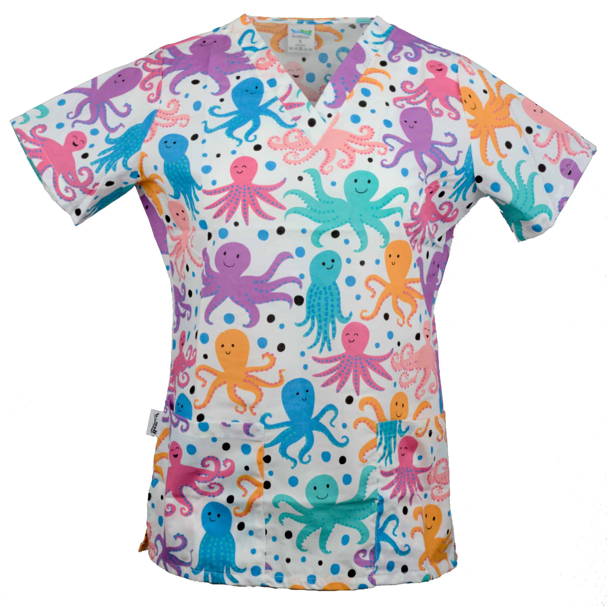 Туника Бамбина с принт цветни октоподи и къс ръкав. Съставът на туниката е 97% памук и 3% еластан. Кройката е вталена, със V-образно деколте, фианки и бие на гърба. Има добавени два големи джоба, като върху десния джоб има по-малък джоб с разделение за химикал. Туниката има добавени цепки за повече комфорт по време на работния ден. Материята е еластична и дишаща и позволява циркулация на въздуха, което предотвартява изпотяването. Добавена е и технология 3D Flex за повече удобство и технология за запазване на цвета – CL 40°С, която гарантира запазнето на цветовете за по-дълго време. Туника Бамбина – октоподи е подходяща за работно облекло на персонал в детски ясли и градини, ветеринарни и медицински кабинети.
