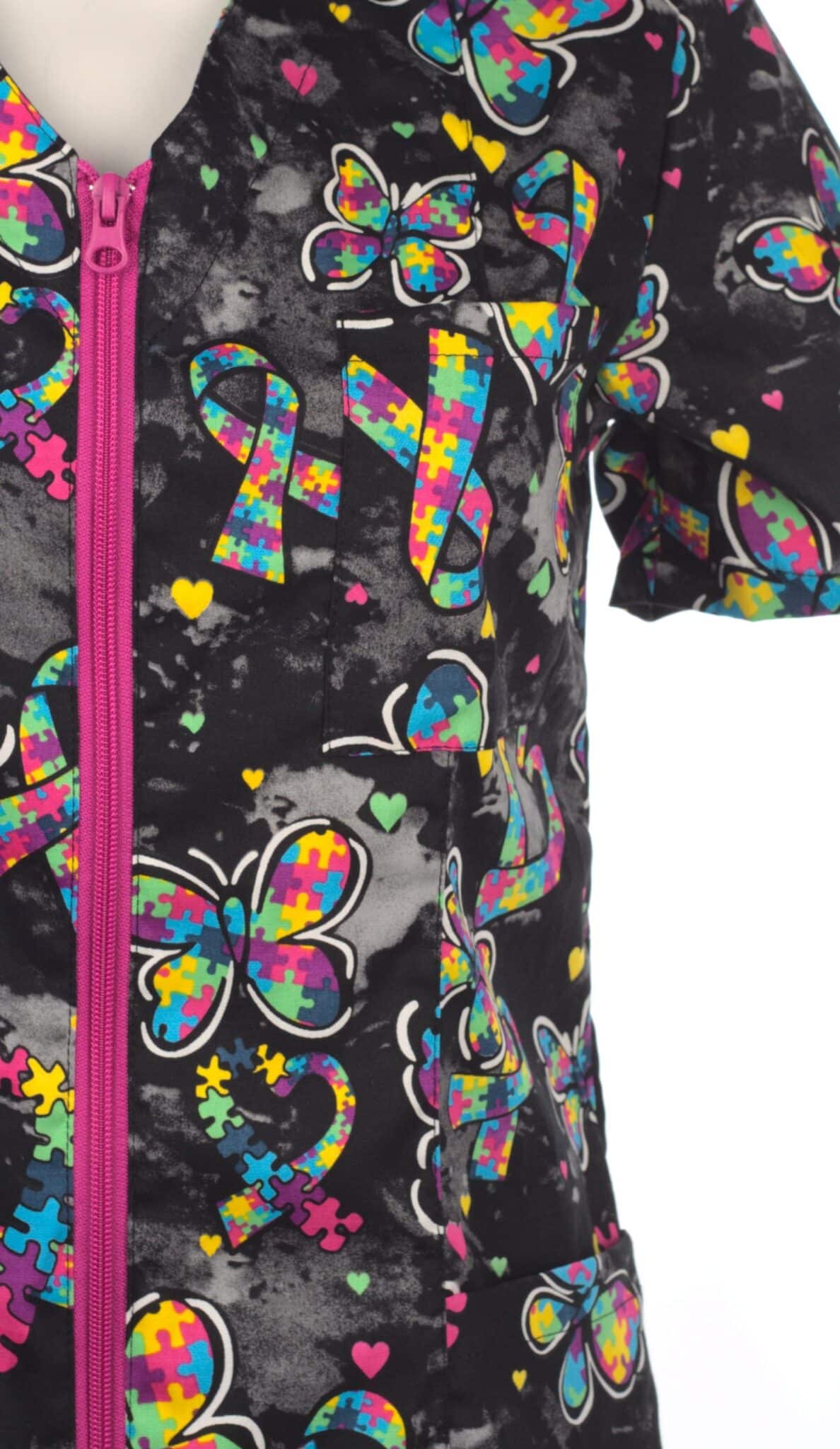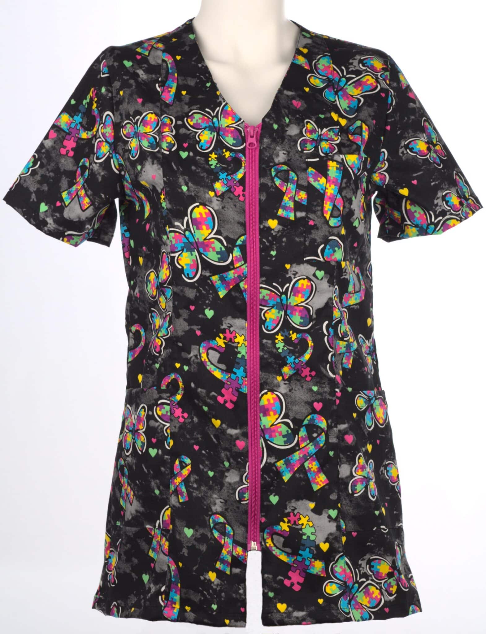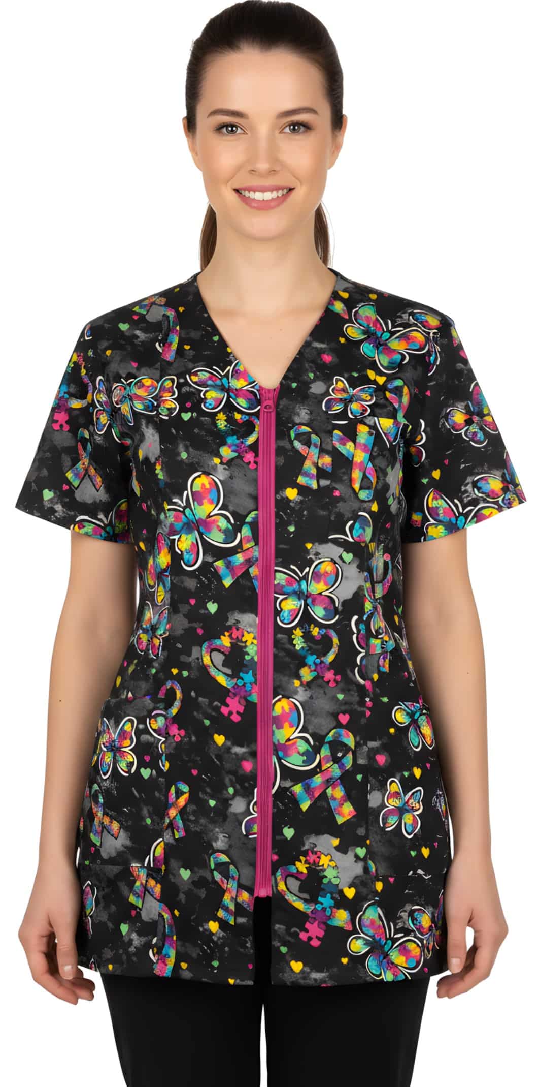 Медицинска туника с щампа Бътерфлай с цип и три джоба. Моделът е изработен с къс ръкав, остро деколте и вталяване в кръста. Чудесно предложение за работна униформа на медицински работници, персонал в детски заведение, също за фризьорки, масажистки, фармацефти и други. Моделът е изпълнен от лек памучен плат в красив тъмен десен с щампа на пеперуди в контрастни ярки цветове. Материята е много мека и не запарва, което ви гарантира комфорт през целия работен ден. При избор на размер от туника Бътерфлай с цип е добре да се спрете на един, или два размера по-голяма туника. За да се ориентирате кой е подходящия за вас размер, разгледайте таблиците с размери, като кройката на този модел, съвпада с тази на туника с копче.