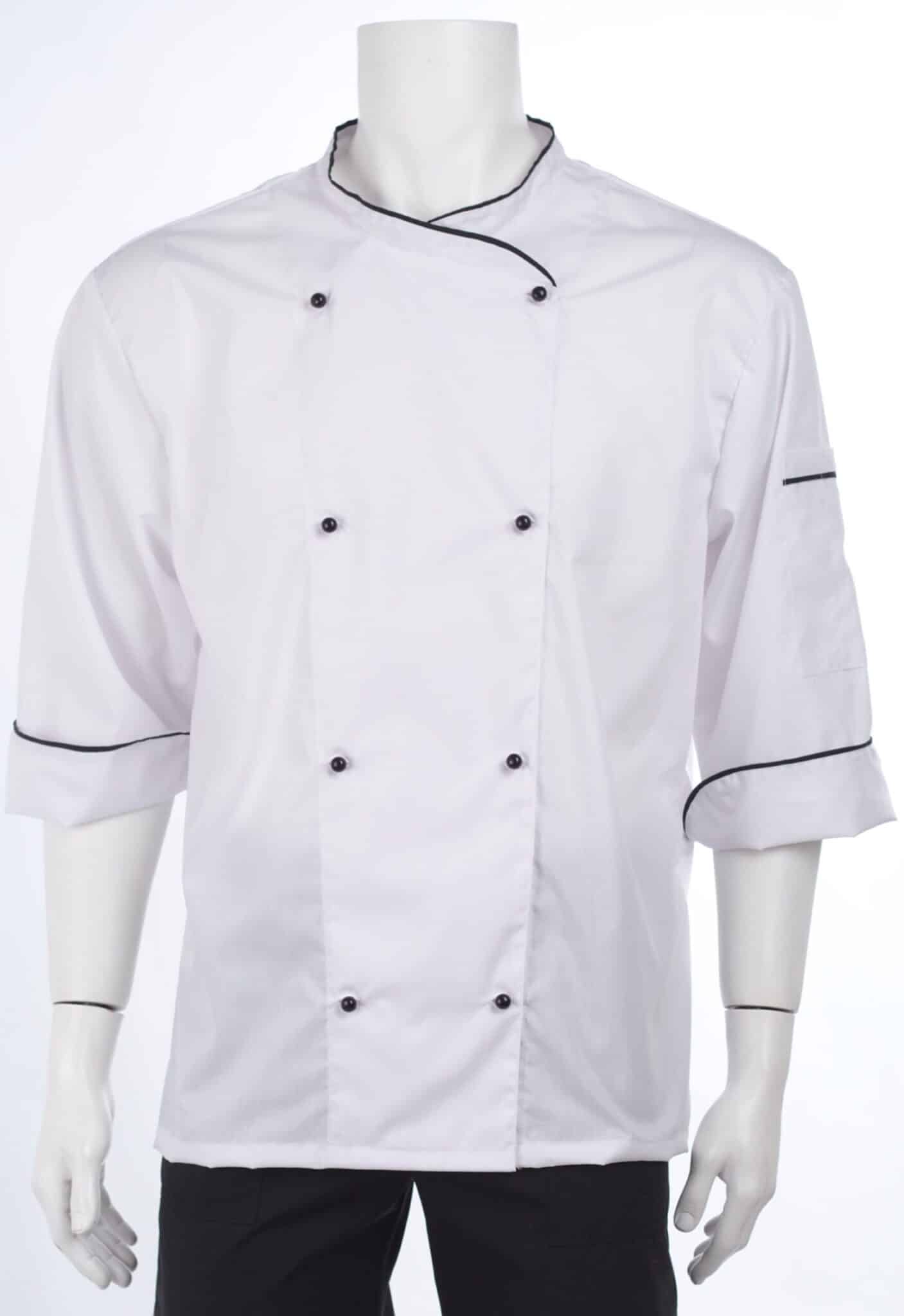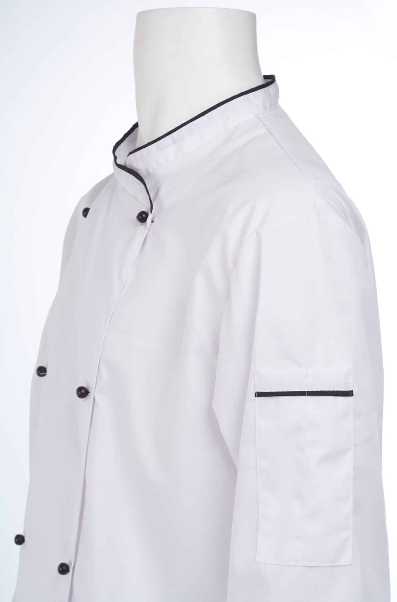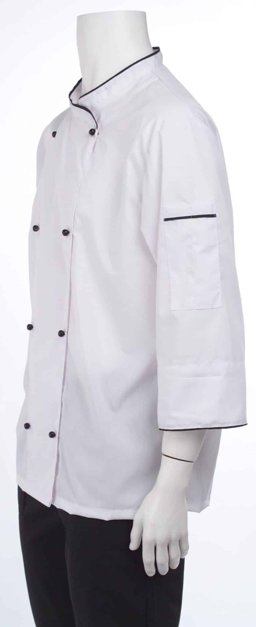 Асиметрична туника за готвач, бяла, с копчета тип пешка, които придават много елегантна визия на модела. Изработена е от плат смес от памук с полиестер в бял цвят с декоративен черен кант. Кройката е права, универсална и е подходяща както за мъже, така и за дами. Материята е много лесна за поддръжка, изсъхва бързо след пране и се глади лесно. Туниката придава много елегантна визия на всеки готварски персонал. Асиметрична туника за готвач с копчета тип пешка освен бяла може също така да бъде изработена в червен и черен цвят. Цветът на копчетата пешка може да бъде по ваш избор – червен, бял или черен. Ако желаете, имате възможност да поръчате отделно само копчета тип пешка. Бихме могли да изработим готварски туники и в различни от показаните в сайта цветове, като цената ще се промени. Потърсете ни за справка.