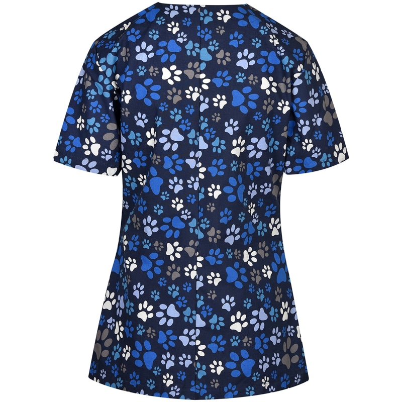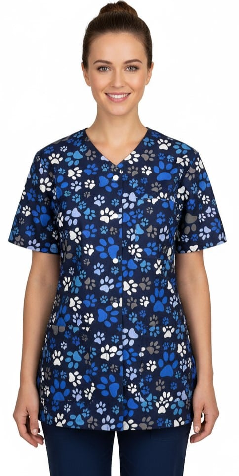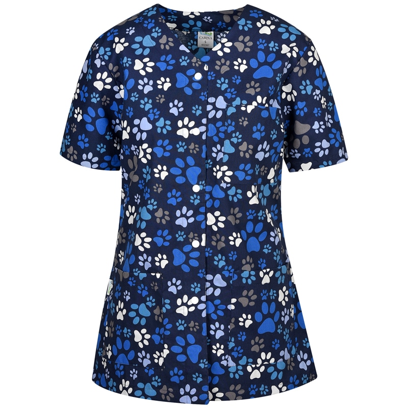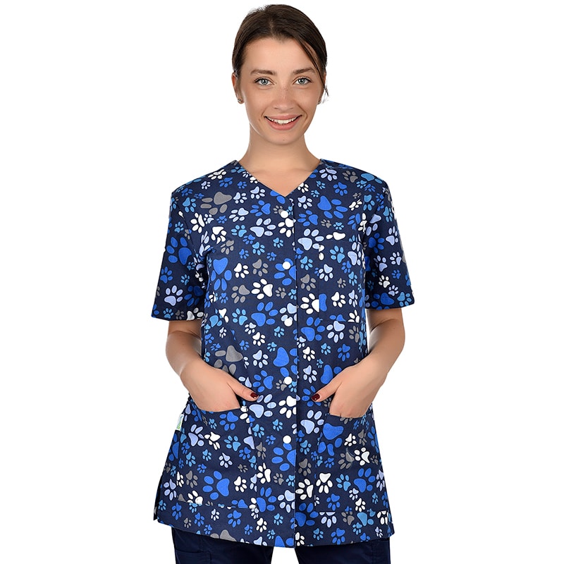 Туника Карина с цветен принт лапи в сини тонове. Туниката е с къс ръкав и тик-так закопчаване. Има прав силует и свободна кройка. Острото и деколте и късият ръкав допринасят за стилна и модерна визия. Туниката има три джоба: горен малък джоб и два долни дълбоки джоба. Съставът и е  50% памук, 50% ПЕ. Туниката е от дишаща материя с еластан и 3D Flex технология за максимален комфорт по време на работа.  Приложена технология CL 40°C за запазване на цвета при машинно и ръчно пране. Туника Карина с принт лапи е изключително подходяща за ветеринари и студенти по ветеринарна медицина. Забавният и принт я прави приложима и за персонал в детски градини и ясли, както и за стоматолози и лекари работещи  с деца.