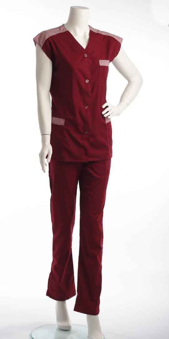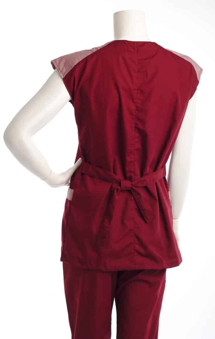 Туника с колан – бордо с копчета и три джоба. Изработена е с вталена кройка и с паднал безшевен ръкав за повече комфорт. Закопчаването е отпред с копчета по средата, има два големи странични джоба и един горен джоб. Подходяща е при работа по хигиена и почистване, отлична е за персонал в производството, складове, в детски заведения и др. Декоративните елементи на туника с колан в бордо могат да бъдат в каре, или райе, според наличността на плат в производствения отдел!