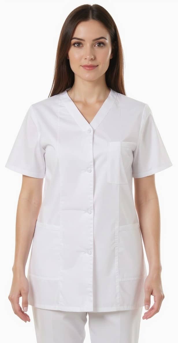 Туника с копчета бяла на цвят. Дизайнът е с елегантна леко вталена кройка, с къс ръкав и закопчаване отпред по средата. Моделът е с изчистено деколте. Има два удобни странични джоба , прикачени към страничните шевове и един отляво горе. Туника с копчета бяла, е подходяща за персонал в търговски обекти, складове, кухни, хотели, фризьори и производсто. Също така е често предпочитана от медициснки работници, лаборанти и хигиенисти. Леката материя гарантира добра проветривост, лесно пране, гладене и бързо съхнене. За завършена работна униформа разгледайте всичките ни предложения за панталони унисекс.