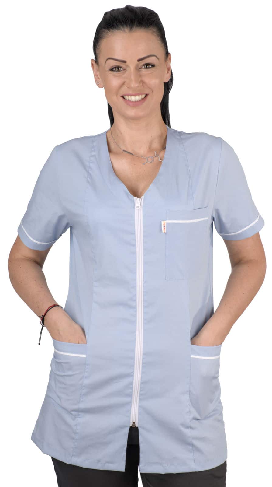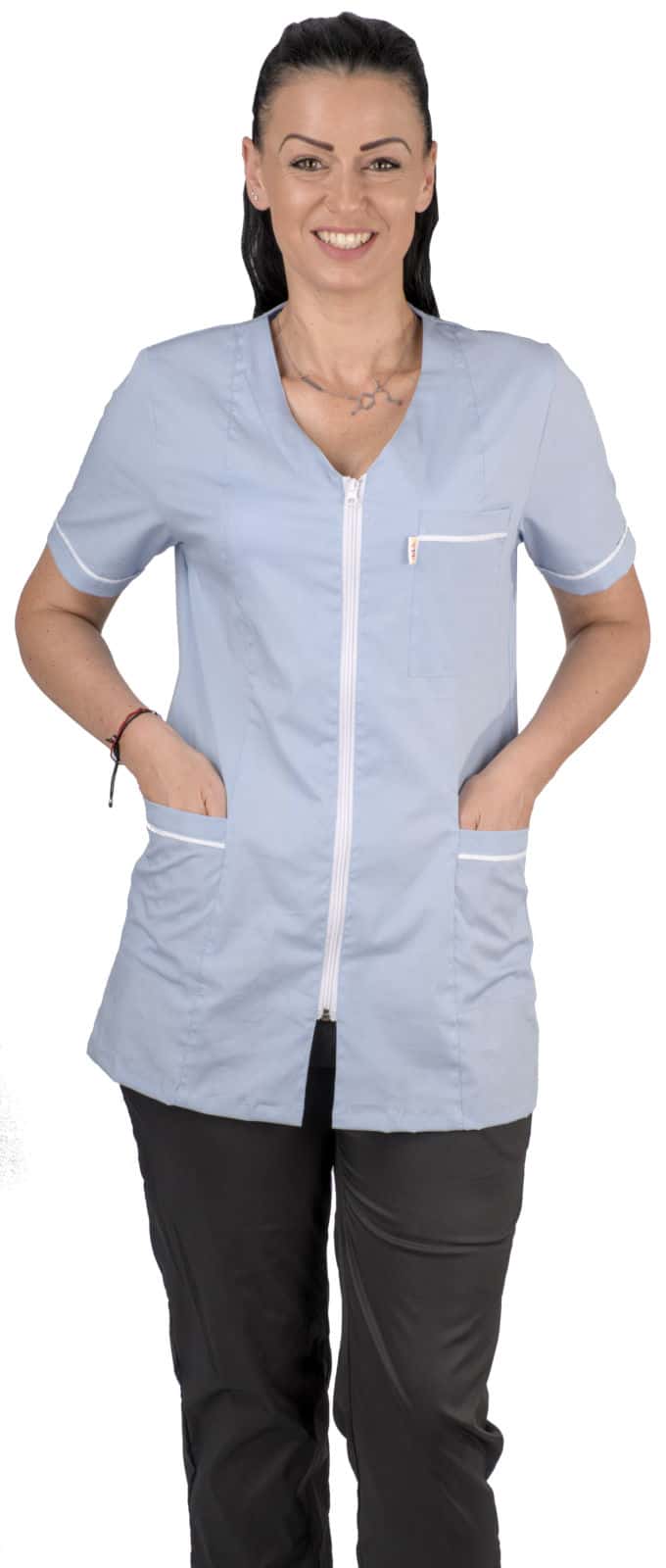 Туника с цип – светлосиня е перфектен избор за работещите в сферата на медицината, почистване и обслужване. Изработена е от висококачествен плат със състав 97% памук и 3% еластан, който осигурява комфорт и свобода на движение през целия ден.