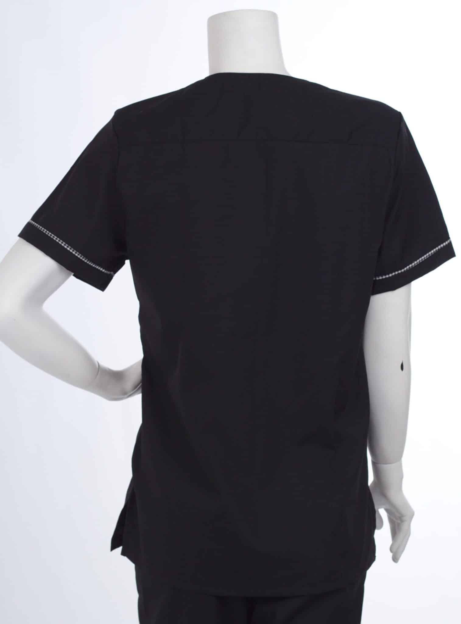 Туника с права унисекс кройка, черна с кант пепит. Стилна, удобна и практична. Туниката е с къс ръкав и остро V образно деколте. Моделът е свободен и много удобен, пасва както на мъже, така и на дами. Туника унисекс черна е много подходяща като работна униформа за медицински работници, персонал в козметични студия, работници в кухня, камериерки и още много други. Материята е лека и изключително практична. Изсъхва бързо след пране и се глади много лесно. Туниката може да бъде комбинирана с панталон унисекс пепит.