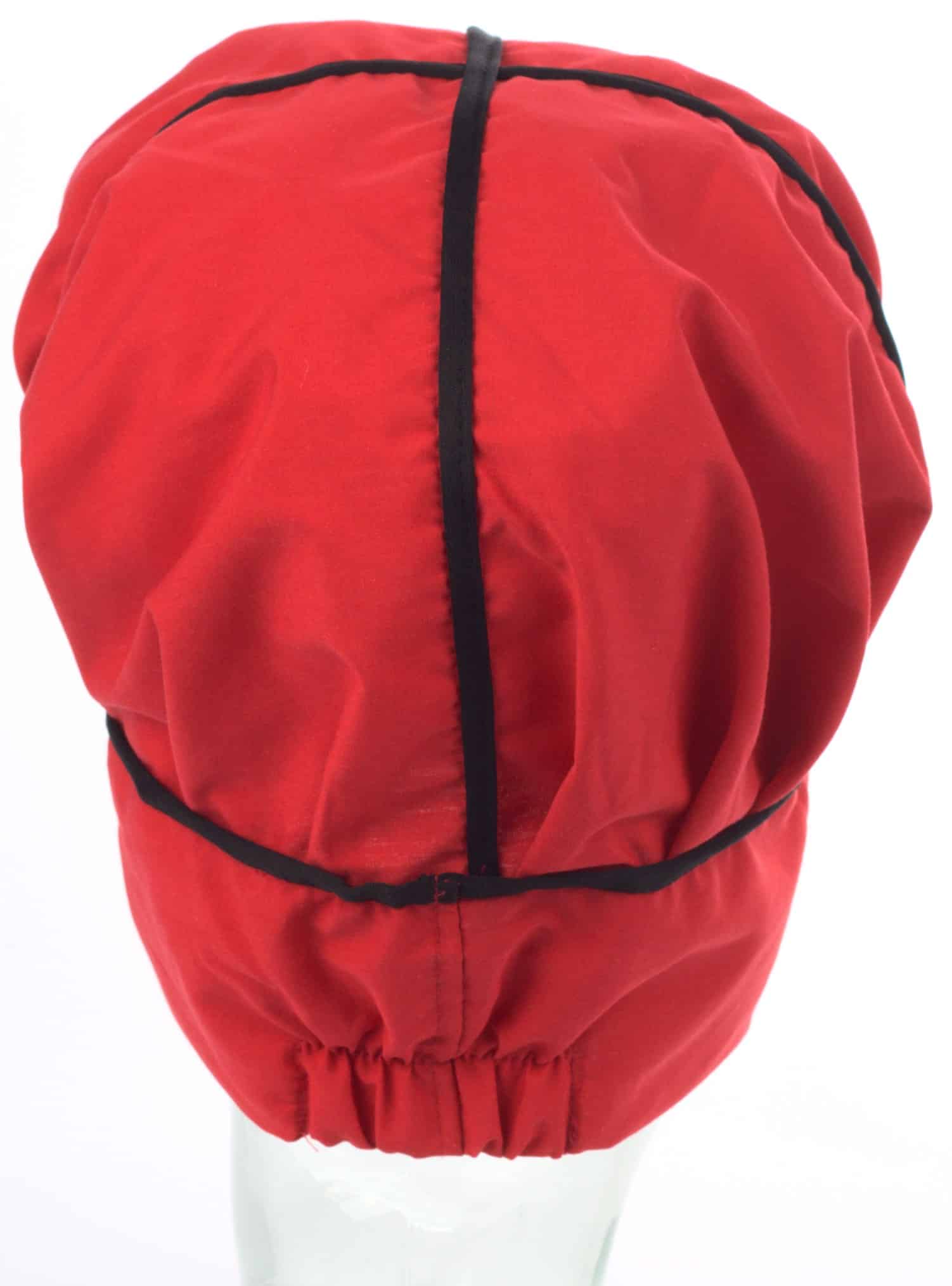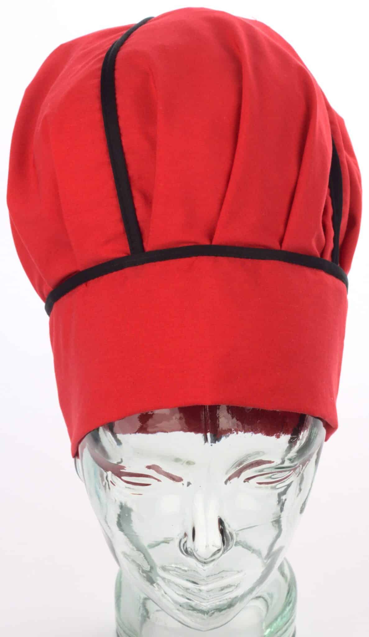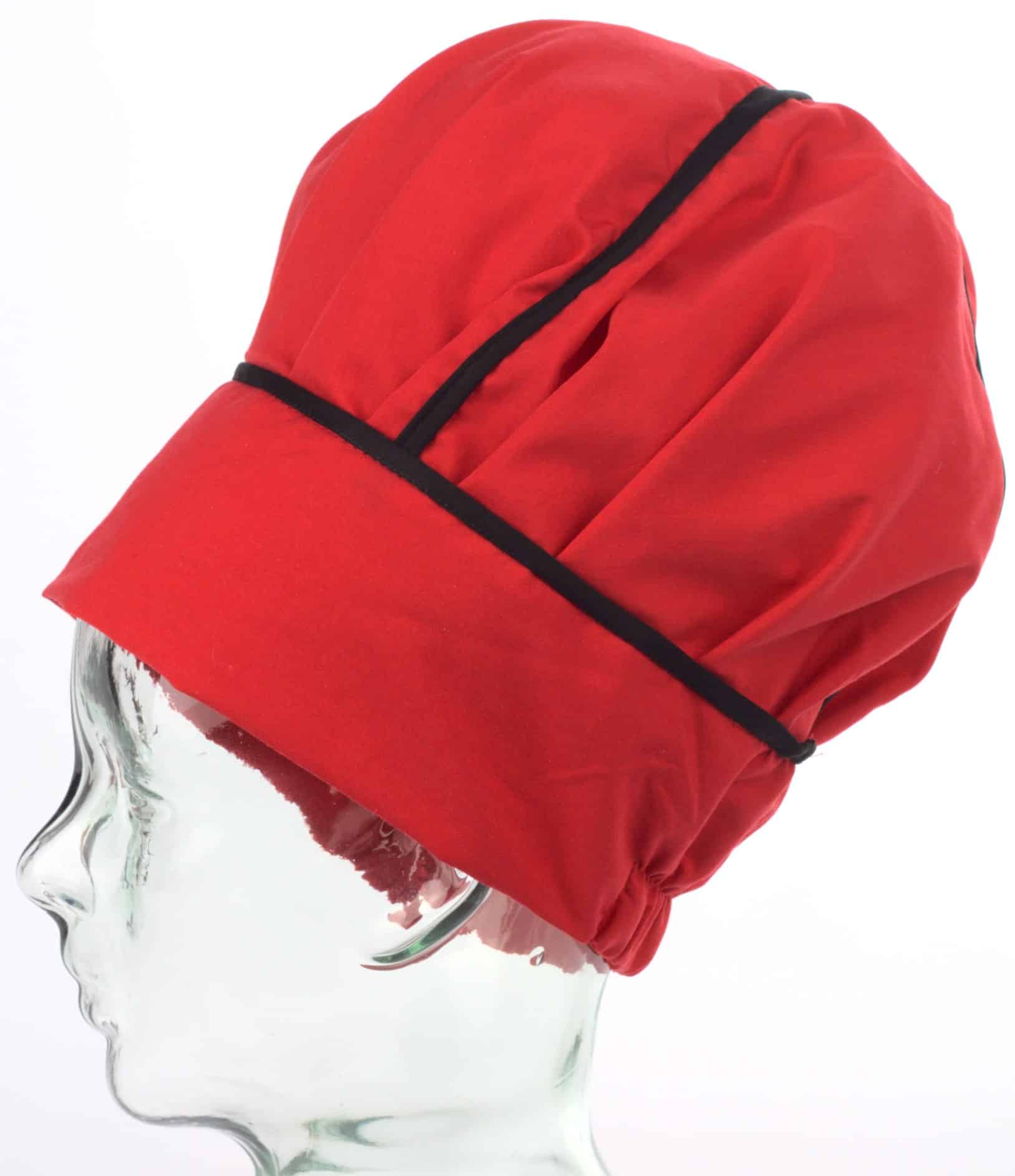 Удобна и практична шапка за готвач тип „пуканка“ червена на цвят. Кантът на шапката може да бъде по избор на клиента черен, или бял. Шапката е изработена от лека и лесна за поддръжка материя. Размерът на шапката е универсален. Моделът има малък ластик отзад, който регулира широчината според необходимото. Шапка за готвач тип Пуканка – червена е идеално допълнение към вашата червена готварска туника. Предлагаме този модел шапка също в черен и в бял цвят. Можете да завършите готварската си униформа с подходящ модел сабо.
