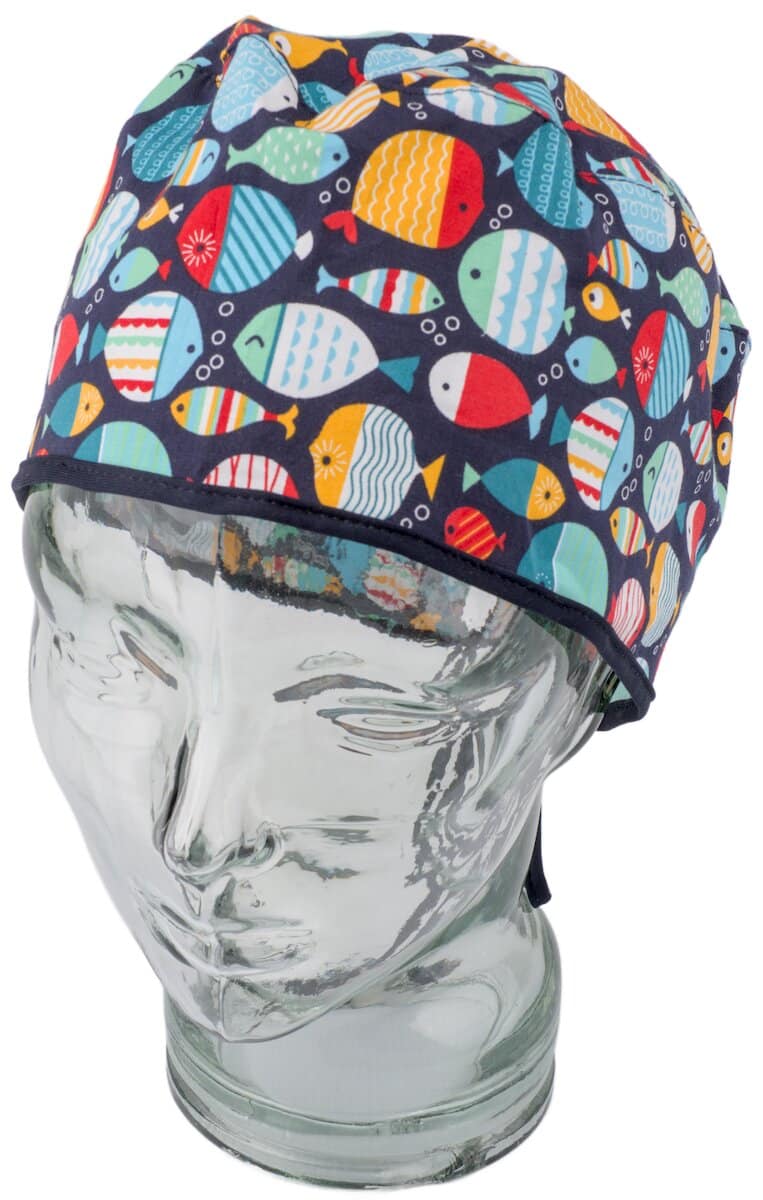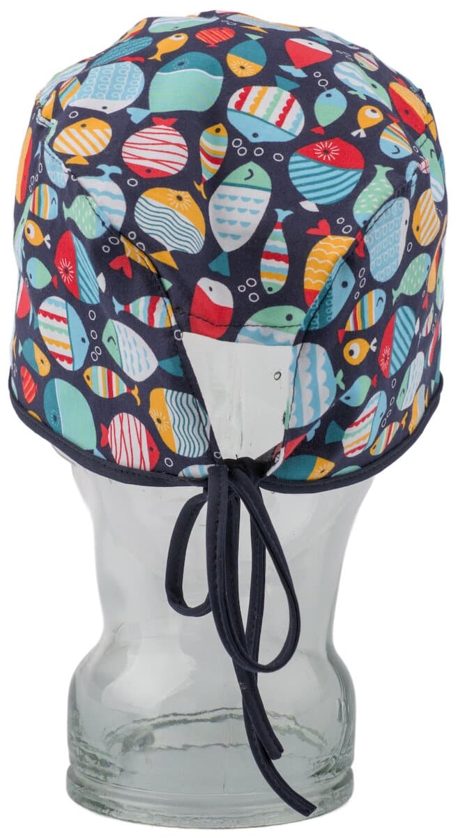 Шапка хирургическа с връзки с щампа Fish с цветни рибки различни цветове. Идеално допълнение към медицинската ви униформа. Шапката е изработена от плат с високо съдържание на памук. Осигурява лекота през дългите часове на работа и няма да ви запари. Широчината на шапката се регулира с връзки отзад според необходимото. Можете да съчетаете шапка хирургическа Fish с медицинска туника унисекс с щампа Fish, както и с кърпа за уста Fish.