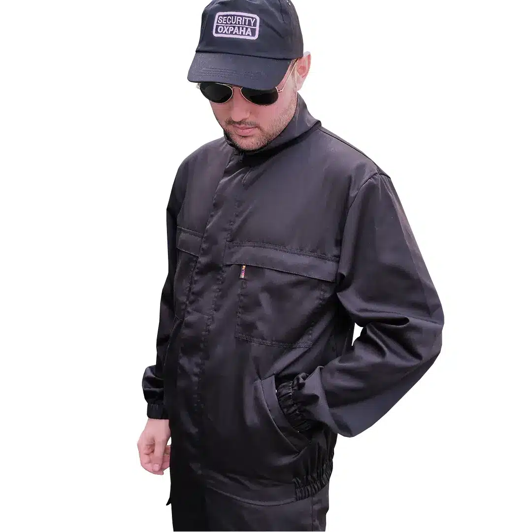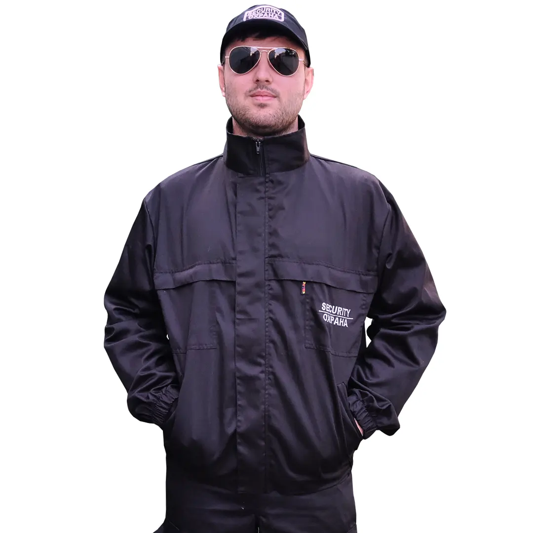 Яке за охранители тънко, черно на цвят. Изработено е от материя смес от 35% памук и 65% полиестер с плътност 160 г/м2. Закопчаването отпред е с цип, като отгоре има и пластрон с велкро. В долната си част и при ръкавите якето е завършено с ластични маншети. Няма подплата и е снабдено с четири джоба. Моделът е подходящо работно облекло за охранители през по-топлите месеци от годината, но може да се ползва и в студено време при работа на закрито. В добавка към якето имате възможност да поръчате надпис за охранители в различен размер. Малкият надпис за отпред на гърдите може да бъде в три варианта: SECURITY/ОХРАНА, ОХРАНА, или SECURITY. Големият надпис за отзад на гърба може да бъде в два варианта: ОХРАНА, или SECURITY. Надписите изработваме чрез компютърна бродерия, или DTF печат. За отлична видимост към яке за охранители тънко предлагаме и опция за добавка на светлоотразителни ленти.