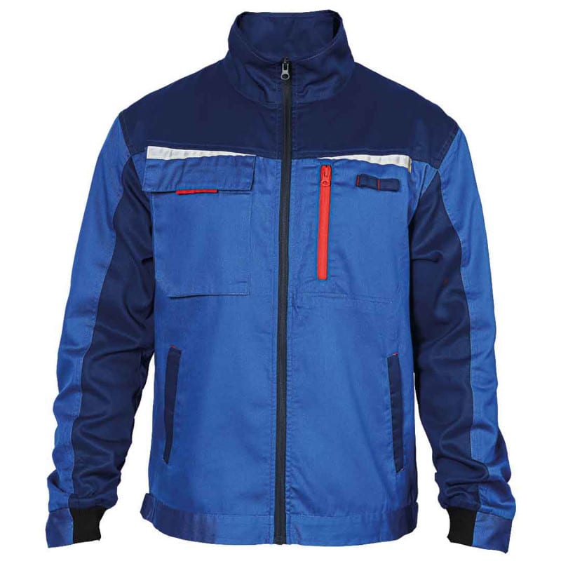 Работно яке модел Призма лятно, синьо на цвят. Моделът е изработен  с тъмносини и сигнални елементи. Материята е Rip-stop, много устойчива на износване, а същевременно не запарва и гарантира комфорт при работа в закрити помещения. Моделът е снабден с четири функционални джоба с ципове, а сигналните елементи гарантират добра видимост. Якето се закопчва отпред с цип по средата и има яка. За завършена работна визия може да съчетаете яке Призма лятно с панталон Призма летен син, или с полугащеризон Призма летен син.